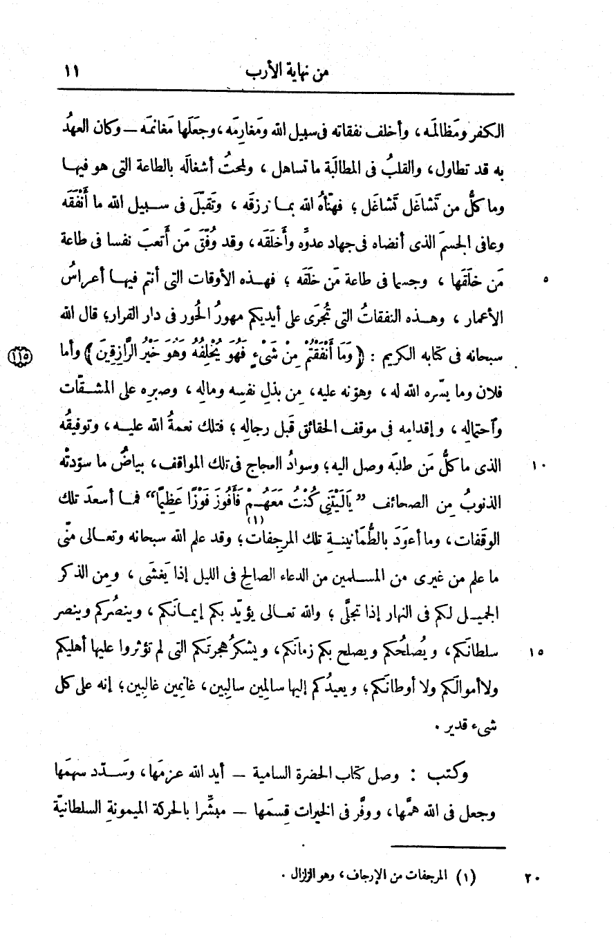 وأما فلان وما يسّره الله له، وهوّنه عليه، من بذل نفسه وماله، وصبره على المشقّات واحتماله، وإقدامه فى موقف الحقائق قبل رجاله؛ فتلك نعمة الله عليه، وتوفيقه الذى ما كلّ من طلبه وصل اليه؛ وسواد العجاج فى تلك المواقف، بياض ما سوّدته الذنوب من الصحائف «يا ليتنى كنت معهم فأفوز فوزا عظيما» فما أسعد تلك الوقفات، وما أعود بالطّمأنينة تلك المرجفات «1» ؛ وقد علم الله سبحانه وتعالى منّى ما علم من غيرى من المسلمين من الدعاء الصالح فى الليل إذا يغشى، ومن الذكر الجميل لكم فى النهار إذا تجلّى؛ والله تعالى يؤيّد بكم إيمانكم، وينصركم وينصر سلطانكم، ويصلحكم ويصلح بكم زمانكم، ويشكر هجرتكم التى لم تؤثروا عليها أهليكم ولا أموالكم ولا أوطانكم؛ ويعيدكم إليها سالمين سالبين، غانمين غالبين؛ إنه على كل شىء قدير.