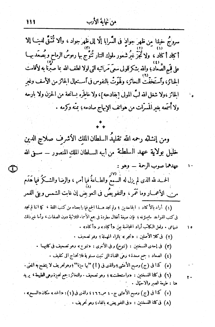 الحمد لله الذى لم يزل له السمع «7» والطاعة فيما أمر، والرضا والشكر فيما هدم من الأعمار وما عمر، والتفويض فى التعويض «8» إن غابت الشمس وبقى القمر