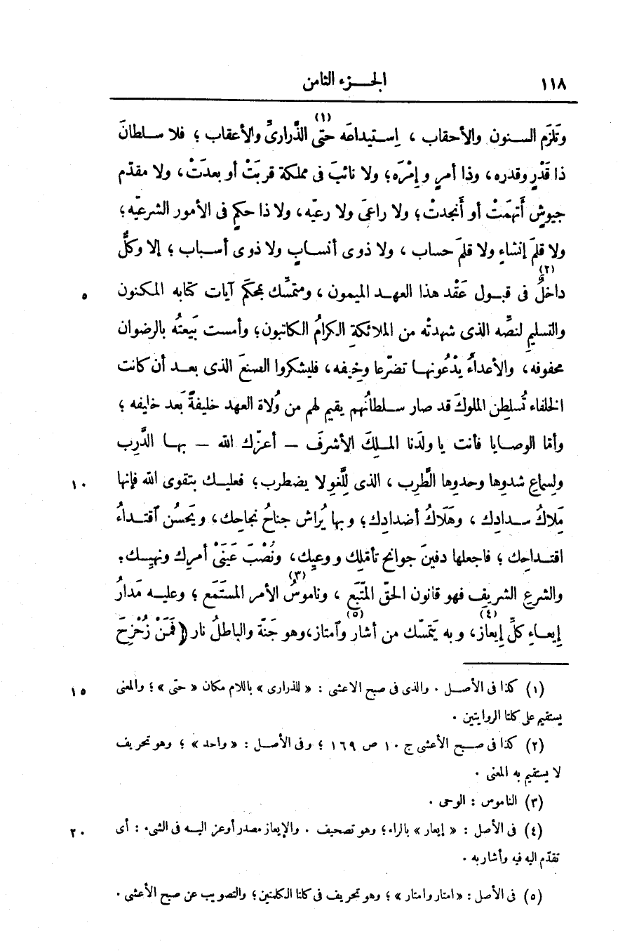 وتلزم السنون والأحقاب، استيداعه حتى «1» الذّرارىّ والأعقاب؛ فلا سلطان ذا قدر وقدره، وذا أمر وإمره؛ ولا نائب فى مملكة قربت أو بعدت، ولا مقدّم جيوش أتهمت أو أنجدت؛ ولا راعى ولا رعيّه، ولا ذا حكم فى الأمور الشرعيّه؛ ولا قلم إنشاء ولا قلم حساب، ولا ذوى أنساب ولا ذوى أسباب؛ إلا وكلّ داخل «2» فى قبول عقد هذا العهد الميمون، ومتمسّك بمحكم آيات كتابه المكنون والتسليم لنصّه الذى شهدته من الملائكة الكرام الكاتبون؛ وأمست بيعته بالرضوان محفوفه، والأعداء يدعونها تضرّعا وخيفه، فليشكروا الصنع الذى بعد أن كانت الخلفاء تسلطن الملوك قد صار سلطانهم يقيم لهم من ولاة العهد خليفة بعد خليفه؛ وأمّا الوصايا فأنت يا ولدنا الملك الأشرف- أعزّك الله- بها الدّرب ولسماع شدوها وحدوها الطّرب، الذى للّغو لا يضطرب؛ فعليك بتقوى الله فإنها ملاك سدادك، وهلاك أضدادك؛ وبها يراش جناح نجاحك، ويحسن اقتداء اقتداحك؛ فاجعلها دفين جوانح تأمّلك ووعيك، ونصب عينى أمرك ونهيك؛ والشرع الشريف فهو قانون الحقّ المتّبع، وناموس «3» الأمر المستمع؛ وعليه مدار إيعاء كلّ إيعاز «4» ، وبه يتمسّك من أشار «5» وامتاز، وهو جنّة والباطل نار