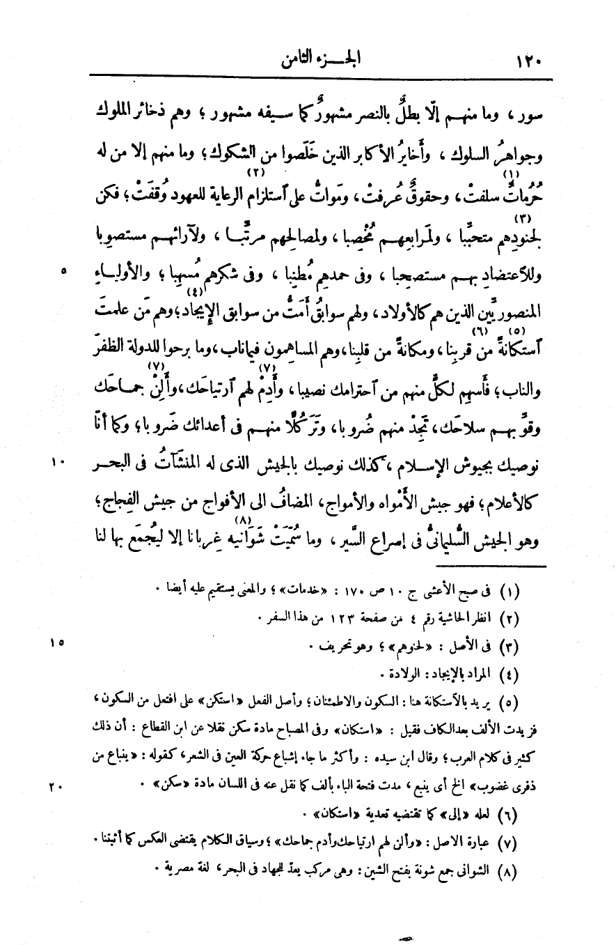 سور، وما منهم إلّا بطل بالنصر مشهور كما سيفه مشهور؛ وهم ذخائر الملوك وجواهر السلوك، وأخاير الأكابر الذين خلصوا من الشكوك؛ وما منهم إلا من له حرمات «1» سلفت، وحقوق عرفت، وموات على استلزام «2» الرعاية للعهود وقفت؛ فكن لجنودهم «3» متحبّبا، ولمرابعهم مخصبا، ولمصالحهم مرتّبا، ولآرائهم مستصوبا وللاعتضاد بهم مستصحبا، وفى حمدهم مطنبا، وفى شكرهم مسهبا؛ والأولياء المنصوريّين الذين هم كالأولاد، ولهم سوابق أمتّ من سوابق الإيجاد «4» ؛ وهم من عملت استكانة «5» من «6» قربنا، ومكانة من قلبنا، وهم المساهمون فيما ناب، وما برحوا للدولة الظفر والناب؛ فأسهم لكلّ منهم من احترامك نصيبا، وأدم لهم ارتياحك، وألن «7» جماحك وقوّ بهم سلاحك، تجد منهم ضروبا، وتر كلّا منهم فى أعدائك ضروبا؛ وكما أنّا نوصيك بجيوش الإسلام، كذلك نوصيك بالجيش الذى له المنشآت فى البحر كالأعلام؛ فهو جيش الأمواه والأمواج، المضاف الى الأفواج من جيش الفجاج؛ وهو الجيش السّليمانىّ فى إسراع السّير، وما سمّيت شوانيه «8» غربانا إلا ليجمع بها لنا