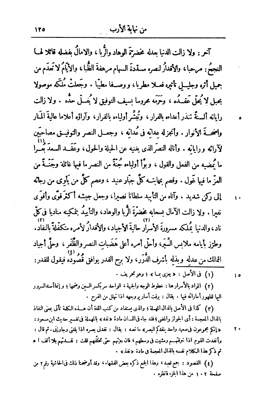 آخر: ولا زالت الدنيا بعدله مخضرّة الوهاد والرّبا، والامال بفضله قائلا لها النجح: مرحبا، والأقدار لنصره مسدّدة السهام مرهفة الظّبا، والأيّام لا تعدم من جميل أثره وجليل تأثيره فعلا مطربا، ووصفا مطيّبا. وجعلت ملكه موصولا بحبل لا يحلّ عقده، وحرمه محروسا بسيف التوفيق لا يفلّ حدّه. ولا زالت راياته ألسنة تنذر أعداءه بالفرار، وتبشّر أولياءه بالقرار، وآراؤه أعلاما عالية المنار واضحة الأنوار. وأنجز له عداته فى عداته، وجعل النصر والتوفيق مصاحبين لآرائه وراياته. وأناله النصر الذى يغنيه عن الحيلة والحول، وعقد السعد بعرا «1» ما يمضيه من الفعل والقول، وبوّأ أولياءه جنّة من النصر ما فيها غائلة وجنّة من العزّ ما فيها غول. وقصم بمهابته كلّ جبّار عنيد، وعصم كلّ من يأوى من رجائه إلى ركن شديد. وآتاه من التأييد سلطانا نصيرا، وجعل جيشه أكثر قوى وأقوى نفيرا. ولا زالت الآمال بسحابه مخضرّة الرّبا والوهاد، والتأييد بتمكينه مناديا فى كلّ ناد، والدنيا بملكه مسرورة الأسرار «2» حالية الأجياد، والأقدار لأمره متكفّلة بالنفاد «3» .