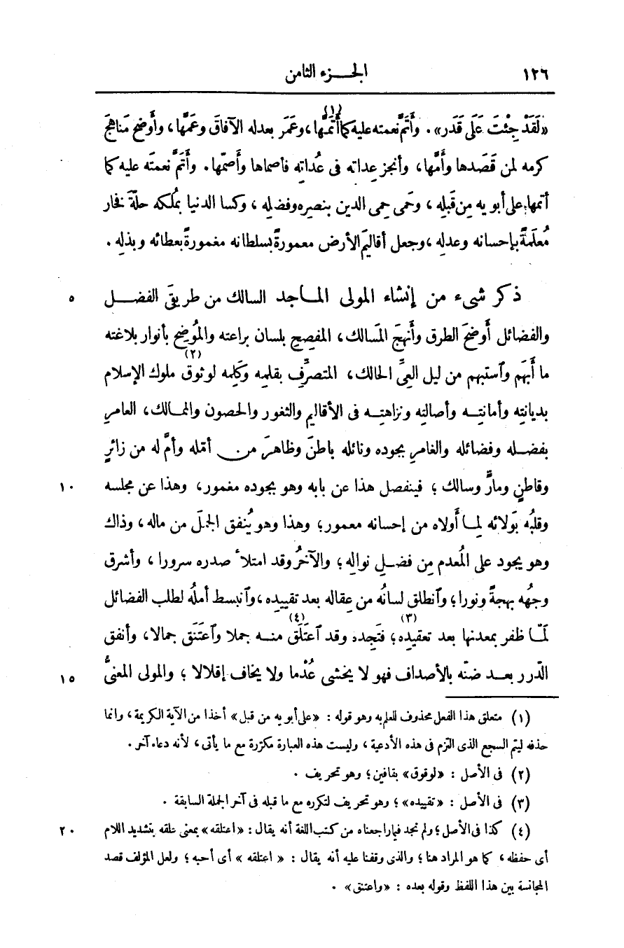 «لقد جئت على قدر» . وأتمّ نعمته عليه كما أتمّها «1» ، وعمر بعدله الآفاق وعمّها، وأوضح مناهج كرمه لمن قصدها وأمّها، وأنجز عداته فى عداته فأصماها وأصمّها. وأتمّ نعمته عليه كما أتمها على أبويه من قبله، وحمى حمى الدين بنصره وفضله، وكسا الدنيا بملكه حلّة فخار معلمة بإحسانه وعدله، وجعل أقاليم الأرض معمورة بسلطانه مغمورة بعطائه وبذله.