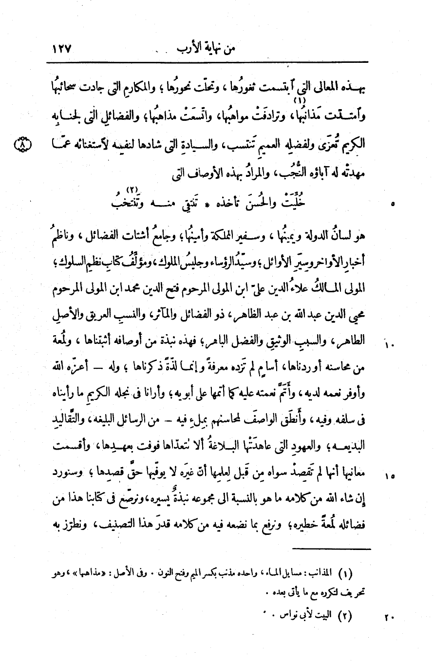 بهذه المعالى التى ابتسمت ثغورها، وتحلّت نحورها؛ والمكارم التى جادت سحائبها وامتدّت مذانبها «1» ، وترادفت مواهبها، واتّسعت مذاهبها؛ والفضائل التى لجنابه الكريم تعزى ولفضله العميم تنتسب، والسيادة التى شادها لنفسه لاستغنائه عمّا مهدته له آباؤه النّجب، والمراد بهذه الأوصاف التى