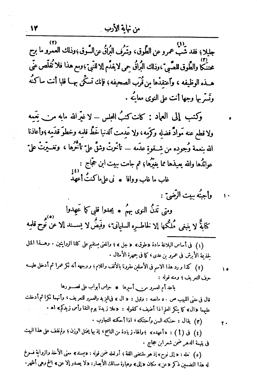 جليلا؛ فقد شبّ «1» عمرو عن الطّوق، وشرف البراق عن السّوق؛ وذلك العمرو «2» ما برح محتنكا «3» والطّوق للصّبىّ، وذلك البراق حمى لا يقدّم إلا للنّبىّ؛ ومع هذا فلا تقلّص عنّى هذه الوظيفه، واعتقدها من قرب الصحيفه؛ فإنك تسكّن بها قلبا أنت ساكنه وتسرّبها وجها أنت على النوى معاينه.