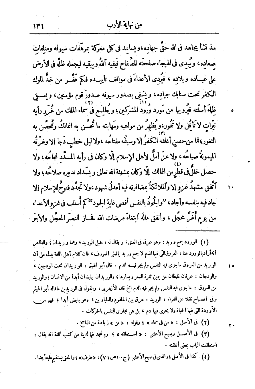 مذ نشأ يجاهد فى الله حقّ جهاده، ويساعد فى كل معركة بمرهفات سيوفه ومتلفات صعاده، ويبدى فى الهيجاء صفحته للصّفاح فيقيه الله ويبقيه ليجعله ظلّه فى الأرض على عباده وبلاده، فيردى الأعداء فى مواقف تأييده فكم عفّر من خدّ لملوك الكفر تحت سنابك جياده؛ ويشفى بصدور سيوفه صدور قوم مؤمنين، ويسقى ظماء أسنّته فيرويها من مورد ورود «1» المشركين؛ ويطلع فى «2» سماء الملك من غرر رأيه نيّرات لا تأفل ولا تغور، ويظهر من مواهبه ومهابته ما تحسّن به انمالك وتحصّن به الثغور؛ فما من حصن أغلقه «3» الكفر إلا وسيفه مفتاحه، ولا ليل خطب دجا إلا وغرّته الميمونة صباحه، ولا عزّ أمل لأهل الإسلام إلّا وكان فى رأيه المسدّد نجاحه، ولا حصل خلل فى قطر «4» من الممالك إلّا وكان بمشيئة الله تعالى وبسداد تدبيره صلاحه؛ ولا اتّفق مشهد غزو إلا والملائكة بمضافرته فيه أعدل شهود، ولا تجدّد فتوح للإسلام إلا جاد فيه بنفسه وأجاد، «والجود بالنفس أقصى غاية الجود» كم أسلف فى غزو الأعداء من يوم أغرّ محجّل، وأنفق ماله ابتغاء مرضات الله فحاز النصر المعجّل والأجر