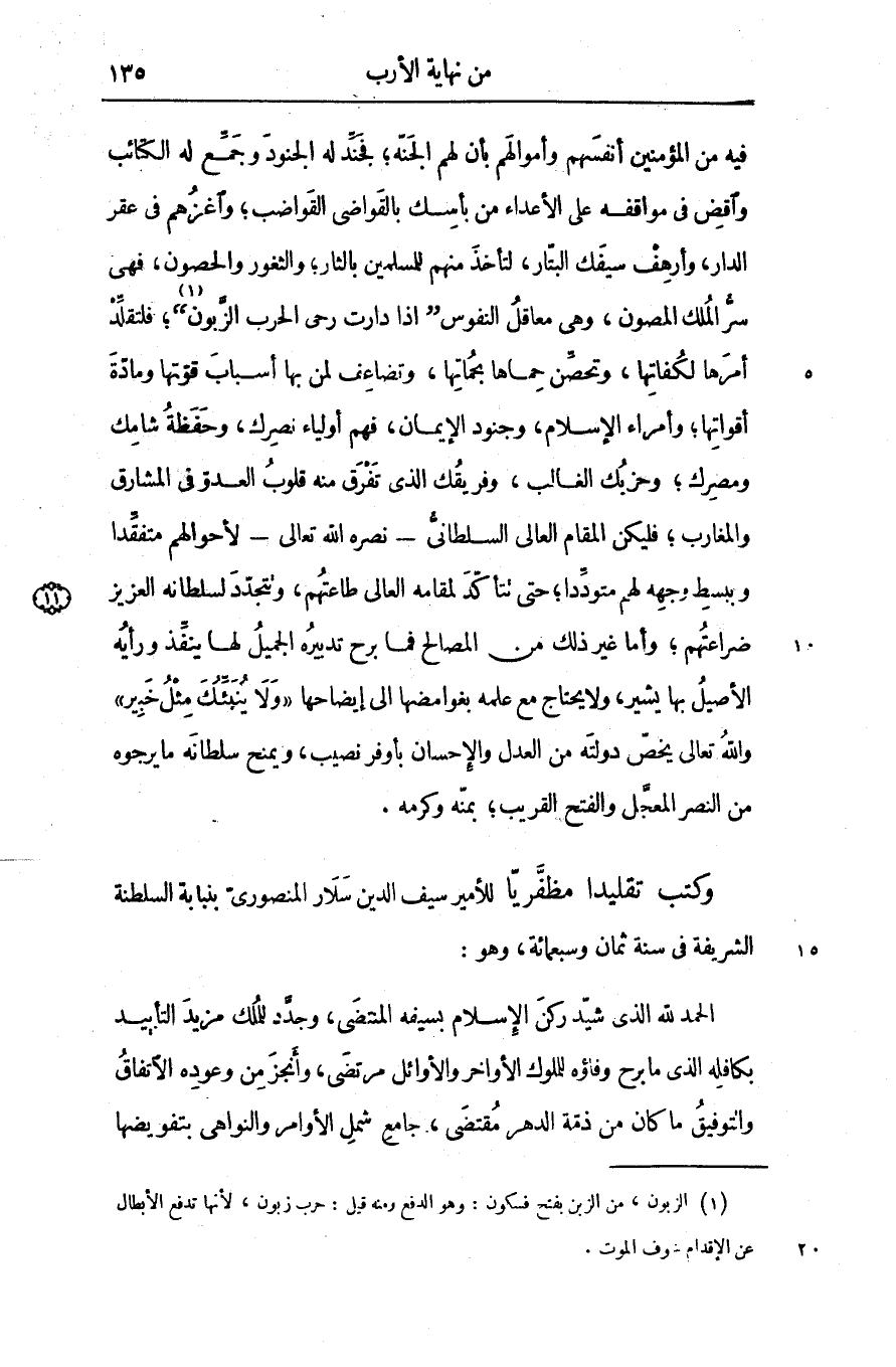 فيه من المؤمنين أنفسهم وأموالهم بأن لهم الجنّة؛ فجنّد له الجنود وجمّع له الكتائب واقض فى مواقفه على الأعداء من بأسك بالقواضى القواضب؛ واغزهم فى عقر الدار، وأرهف سيفك البتّار، لتأخذ منهم للمسلمين بالثار؛ والثغور والحصون، فهى سرّ الملك المصون، وهى معاقل النفوس «اذا دارت رحى الحرب الزّبون «1» » ؛ فلتقلّد أمرها لكفاتها، وتحصّن حماها بحماتها، وتضاعف لمن بها أسباب قوّتها ومادّة أقواتها؛ وأمراء الإسلام، وجنود الإيمان، فهم أولياء نصرك، وحفظة شامك ومصرك؛ وحزبك الغالب، وفريقك الذى تفرق منه قلوب العدوّ فى المشارق والمغارب؛ فليكن المقام العالى السلطانىّ- نصره الله تعالى- لأحوالهم متفقّدا وببسط وجهه لهم متودّدا؛ حتى تتأكّد لمقامه العالى طاعتهم، وتتجدّد لسلطانه العزيز ضراعتهم؛ وأما غير ذلك من المصالح فما برح تدبيره الجميل لها ينفّذ ورأيه الأصيل بها يشير، ولا يحتاج مع علمه بغوامضها الى إيضاحها «ولا ينبئّك مثل خبير» والله تعالى يخصّ دولته من العدل والإحسان بأوفر نصيب، ويمنح سلطانه ما يرجوه من النصر المعجّل والفتح القريب؛ بمنّه وكرمه.