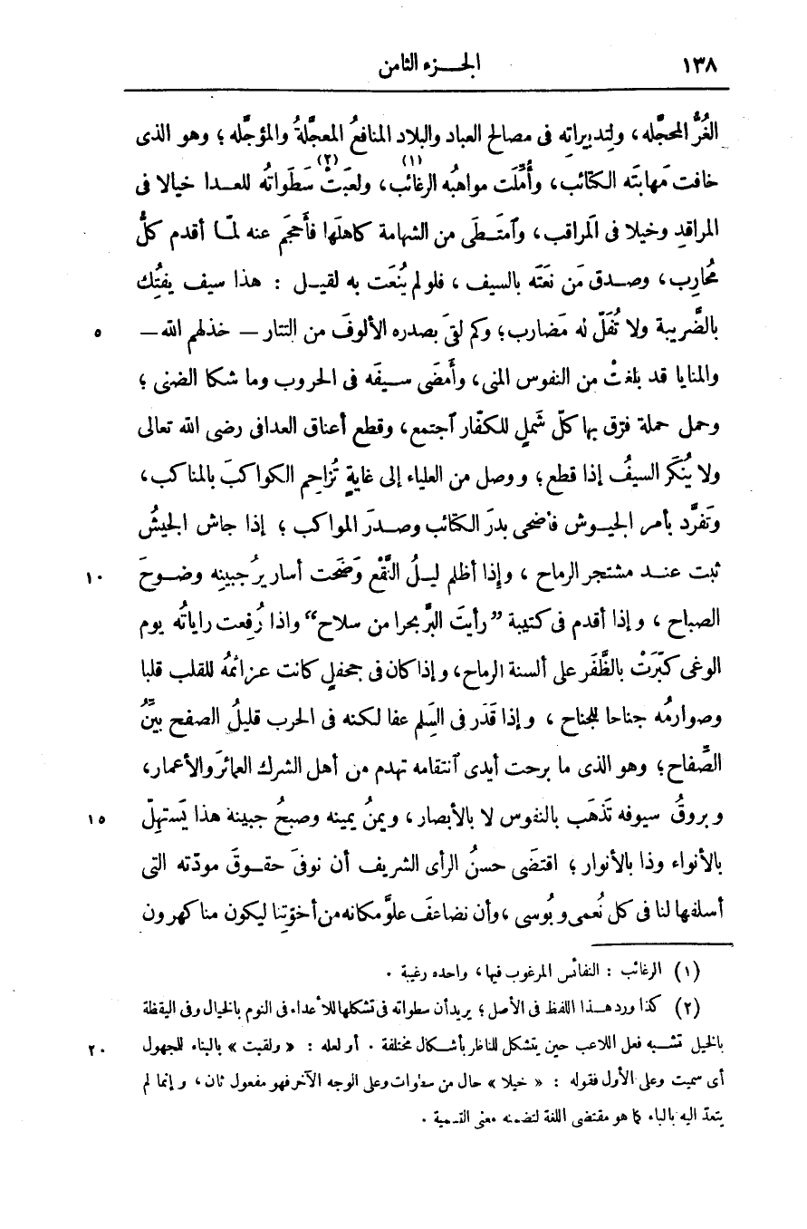 الغرّ المحجّله، ولتدبيراته فى مصالح العباد والبلاد المنافع المعجّلة والمؤجّله؛ وهو الذى خافت مهابته الكتائب، وأمّلت مواهبه الرغائب «1» ، ولعبت «2» سطواته للعدا خيالا فى المراقد وخيلا فى المراقب، وامتطى من الشهامة كاهلها فأحجم عنه لمّا أقدم كلّ محارب، وصدق من نعته بالسيف، فلو لم ينعت به لقيل: هذا سيف يفتك بالضّريبة ولا تفلّ له مضارب؛ وكم لقى بصدره الألوف من التتار- خذلهم الله- والمنايا قد بلغت من النفوس المنى، وأمضى سيفه فى الحروب وما شكا الضنى؛ وحمل حملة فرّق بها كلّ شمل للكفّار اجتمع، وقطع أعناق العدافى رضى الله تعالى ولا ينكر السيف إذا قطع؛ ووصل من العلياء إلى غاية تزاحم الكواكب بالمناكب، وتفرّد بأمر الجيوش فأضحى بدر الكتائب وصدر المواكب؛ إذا جاش الجيش ثبت عند مشتجر الرماح، وإذا أظلم ليل النّقع وضحت أسارير جبينه وضوح الصباح، وإذا أقدم فى كتيبة «رأيت البرّ بحرا من سلاح» واذا رفعت راياته يوم الوغى كبّرت بالظّفر على ألسنة الرماح، وإذا كان فى جحفل كانت عزائمه للقلب قلبا وصوارمه جناحا للجناح، وإذا قدر فى السلم عفا لكنه فى الحرب قليل الصفح بيّن الصّفاح؛ وهو الذى ما برحت أيدى انتقامه تهدم من أهل الشرك العمائر والأعمار، وبروق سيوفه تذهب بالنفوس لا بالأبصار، ويمن يمينه وصبح جبينة هذا يستهلّ بالأنواء وذا بالأنوار؛ اقتضى حسن الرأى الشريف أن نوفى حقوق مودّته التى أسلفها لنا فى كل نعمى وبوسى، وأن نضاعف علوّ مكانه من أخوّتنا ليكون منا كهرون