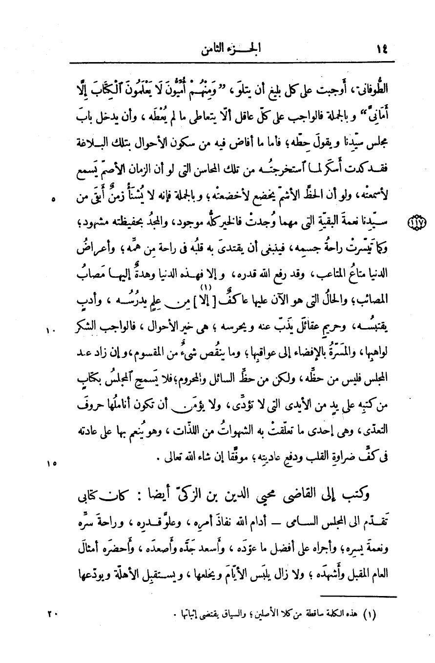 الطّوفانىّ، أوجبت على كل بليغ أن يتلو، «ومنهم أمّيّون لا يعلمون الكتاب إلّا أمانىّ» وبالجملة فالواجب على كلّ عاقل ألّا يتعاطى ما لم يعطه، وأن يدخل باب مجلس سيّدنا ويقول حطّه؛ فأما ما أفاض فيه من سكون الأحوال بتلك البلاغة فقد كدت أسكر لما استخرجته من تلك المحاسن التى لو أن الزمان الأصم يسمع لأسمعته، ولو أن الحظّ الأشم يخضع لأخضعته؛ وبالجملة فإنه لا يشنأ زمن أبقى من سيّدنا نعمة البقيّة التى مهما وجدت فالخير كلّه موجود، والمجد بحفيظته مشهود؛ وكما تيسّرت راحة جسمه، فينبغى أن يقتدى به قلبه فى راحة من همّه؛ وأعراض الدنيا متاع المتاعب، وقد رفع الله قدره، وإلا فهذه الدنيا وهدة إليها مصاب المصائب؛ والحال التى هو الآن عليها عاكف [إلا «1» ] من علم يدرسه، وأدب يقتبسه، وحريم عقائل يذبّ عنه ويحرسه؛ هى خير الأحوال، فالواجب الشكر لواهبها، والمسرّة بالإفضاء إلى عواقبها؛ وما ينقص شىء من المقسوم، وإن زاد عند المجلس فليس من حظّه، ولكن من حظّ السائل والمحروم؛ فلا يسمح المجلس بكتاب من كتبه على يد من الأيدى التى لا تؤدّى، ولا يؤمن أن تكون أناملها حروف التعدّى، وهى إحدى ما تعلّقت به الشهوات من اللذّات، وهو ينعم بها على عادته فى كفّ ضراوة القلب ودفع عاديته؛ موفّقا إن شاء الله تعالى.