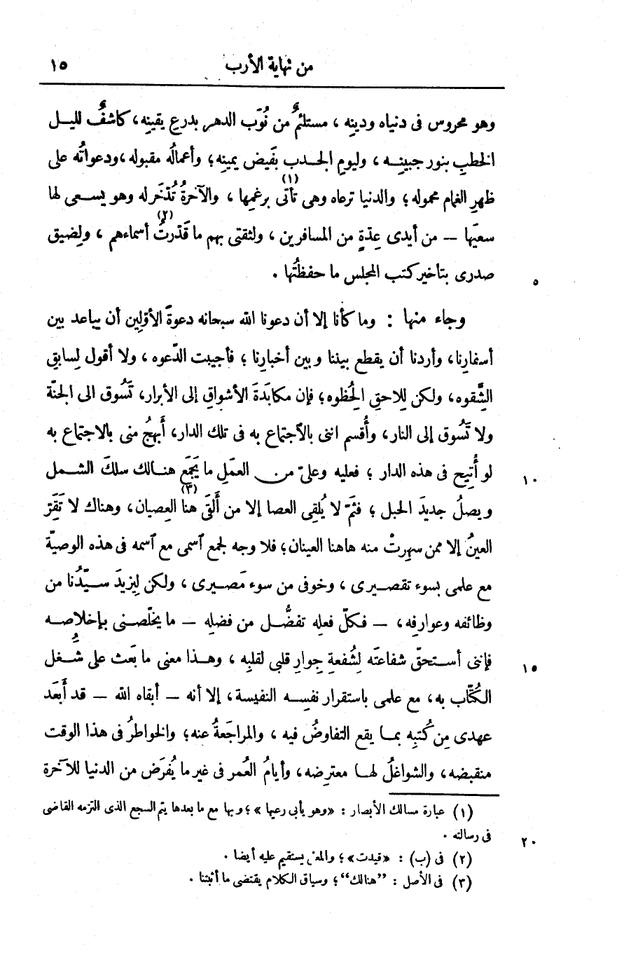 وجاء منها: وما كأنا إلا أن دعونا الله سبحانه دعوة الأوّلين أن يباعد بين أسفارنا، وأردنا أن يقطع بيننا وبين أخبارنا؛ فأجيبت الدّعوه، ولا أقول لسابق الشّقوه، ولكن للاحق الحظوه؛ فإن مكابدة الأشواق الى الأبرار، تسوق الى الجنّة ولا تسوق إلى النار، وأقسم اننى بالاجتماع به فى تلك الدار، أبهج منى بالاجتماع به لو أتيح فى هذه الدار؛ فعليه وعلىّ من العمل ما يجمع هنا لك سلك الشمل ويصل جديد الحبل؛ فثمّ لا يلقى العصا إلا من ألقى هنا «3» العصيان، وهناك لا تقرّ العين إلا ممن سهرت منه هاهنا العينان؛ فلا وجه لجمع اسمى مع اسمه فى هذه الوصيّة مع علمى بسوء تقصيرى، وخوفى من سوء مصيرى، ولكن ليزيد سيّدنا من وظائفه وعوارفه،- فكلّ فعله تفضّل من فضله- ما يخلّصنى بإخلاصه فإننى أستحق شفاعته لشفعة جوار قلبى لقلبه، وهذا معنى ما بعث على شغل الكتّاب به، مع علمى باستقرار نفسه النفيسة، إلا أنه- أبقاه الله- قد أبعد عهدى من كتبه ما يقع التفاوض فيه، والمراجعة عنه؛ والخواطر فى هذا الوقت منقبضه، والشواغل لها معترضه، وأيام العمر فى غير ما يفرض من الدنيا للآخرة