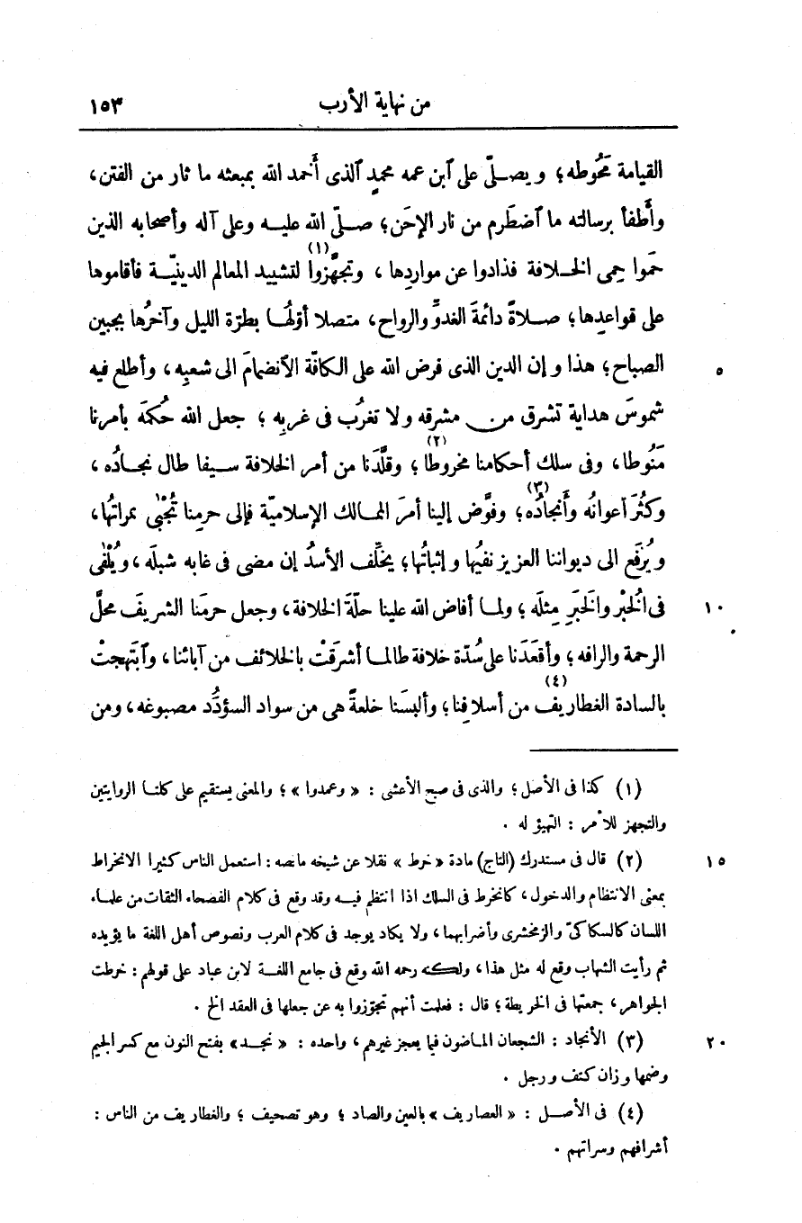 القيامة محوطه؛ ويصلّى على ابن عمه محمد الذى أحمد الله بمبعثه ما ثار من الفتن، وأطفأ برسالته ما اضطرم من نار الإحن؛ صلّى الله عليه وعلى آله وأصحابه الذين حموا حمى الخلافة فذادوا عن مواردها، وتجهّزوا «1» لتشييد المعالم الدينيّة فأقاموها على قواعدها؛ صلاة دائمة الغدوّ والرواح، متصلا أوّلها بطرّة الليل وآخرها بجبين الصباح؛ هذا وإن الذين الذى فرض الله على الكافّة الانضمام الى شعبه، وأطلع فيه شموس هداية تشرق من مشرقه ولا تغرب فى غربه؛ جعل الله حكمه بأمرنا منوطا، وفى سلك أحكامنا مخروطا «2» ؛ وقلّدنا من أمر الخلافة سيفا طال نجاده، وكثر أعوانه وأنجاده «3» ؛ وفوّض إلينا أمر الممالك الإسلاميّة فإلى حرمنا تجبى ممراتها، ويرفع الى ديواننا العزيز نفيها وإثباتها؛ يخلّف الأسد إن مضى فى غابه شبله، ويلفى فى الخبر والخبر مثله؛ ولما أفاض الله علينا حلّة الخلافة، وجعل حرمنا الشريف محلّ الرحمة والرافه؛ وأقعدنا على سدة خلافة طالما أشرقت بالخلائف من آبائنا، وابتهجت بالسادة الغطاريف»