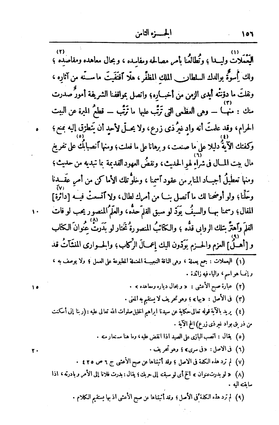 اليعملات «1» وليدا؛ وتطالعنا بأمر مصالحه ومفاسده، وبحال معاهده ومقاصده «2» ؛ ولك أسوة بوالدك السلطان الملك المظفّر، هلّا اقتفيت ما سنّه من آثاره، ونقلت ما دوّنته أيدى الزمن من أخباره؛ واتصل بمواقفنا الشريفة أمور صدرت منك: منها «3» - وهى العظمى التى ترتّب عليها ما ترتّب- قطع الميرة عن البيت الحرام، وقد علمت أنه واد غير ذى زرع، ولا يحلّ لأحد أن يتطرّق إليه بمنع؛ وكفتك الآية «4» دليلا على ما صنعت، وبرهانا على ما فعلت؛ ومنها انصبابك «5» على تفريغ مال بيت المال فى شراء «6» لهو الحديث، ونقض العهود القديمة بما تبديه من حديث؛ ومنها تعطيل أجياد المنابر من عقود اسمنا، وخلوّ تلك الأماكن من أمر عقدنا وحلّنا؛ ولو أوضحنا لك ما اتصل بنا من أمرك لطال، ولا اتسعت فيه [دائرة «7» ] المقال؛ رسمنا بها والسيف يودّ لو سبق القلم حدّه، والعلم المنصور يحب لو فات القلم واهتزّ بتلك الروابى قدّه؛ والكتائب المنصورة تختار لو بدرت «8» عنوان الكتاب و [أهل «9» ] العزم والحزم يودّون اليك إعمال الرّكاب؛ والجوارى المنشآت قد