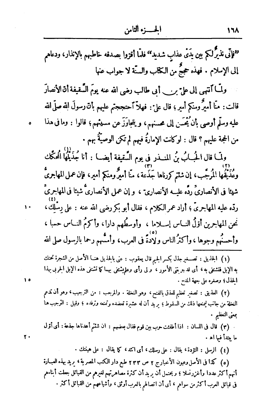 فلمّا أقرّوا بصدقه خاطبهم بالإنذار، ودعاهم إلى الإسلام. فهذه حجج من الكتاب والسنّة لا جواب عنها ولمّا انتهى إلى علىّ بن أبى طالب رضى الله عنه يوم السّقيفة أنّ الأنصار قالت: منّا أمير ومنكم أمير؛ قال علىّ: فهلّا احتججتم عليهم بأنّ رسول الله صلّى الله عليه وسلّم أوصى بأن يحسن إلى محسنهم، ويتجاوز عن مسيئهم؛ قالوا: وما فى هذا من الحجة عليهم؟ قال: لو كانت الإمارة فيهم لم تكن الوصيّة بهم.