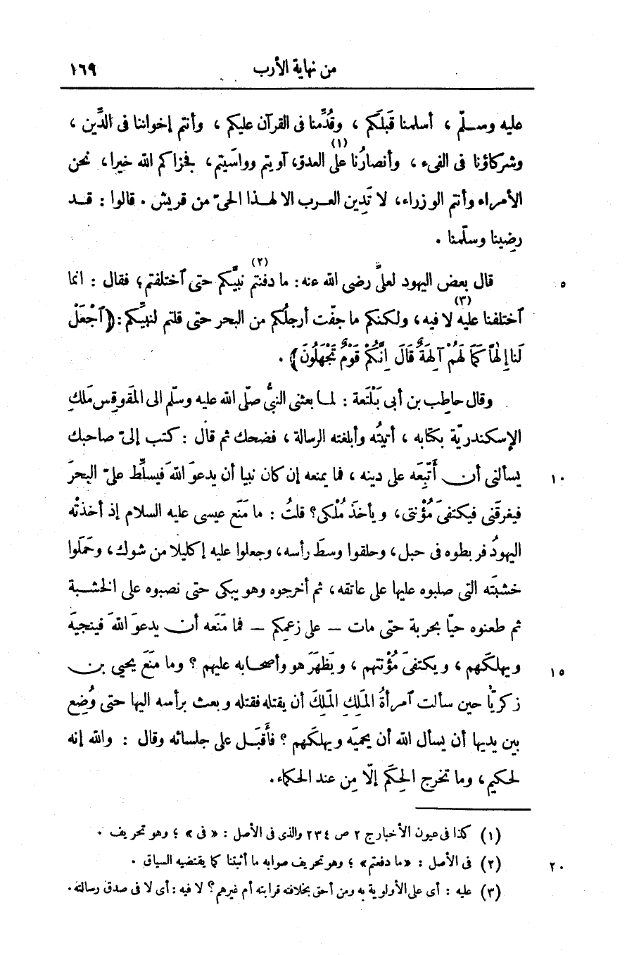وقال حاطب بن أبى بلتعة: لما بعثنى النبىّ صلّى الله عليه وسلّم الى المقوقس ملك الإسكندريّة بكتابه، أتيته وأبلغته الرسالة، فضحك ثم قال: كتب إلىّ صاحبك يسألنى أن أتّبعه على دينه، فما يمنعه إن كان نبيا أن يدعو الله فيسلّط علىّ البحر فيغرقنى فيكتفى مؤنتى، ويأخذ ملكى؟ قلت: ما منع عيسى عليه السلام إذ أخذته اليهود فربطوه فى حبل، وحلقوا وسط رأسه، وجعلوا عليه إكليلا من شوك، وحملوا خشبته التى صلبوه عليها على عاتقه، ثم أخرجوه وهو يبكى حتى نصبوه على الخشبة ثم طعنوه حيّا بحربة حتى مات- على زعمكم- فما منعه أن يدعو الله فينجيه ويهلكهم، ويكتفى مؤنتهم، ويظهر هو وأصحابه عليهم؟ وما منع يحيى بن زكريّا حين سألت امرأة الملك الملك أن يقتله فقتله وبعث برأسه اليها حتى وضع بين يديها أن يسأل الله أن يحميه ويهلكهم؟ فأقبل على جلسائه وقال: والله إنه لحكيم، وما تخرج الحكم إلّا من عند الحكماء.
