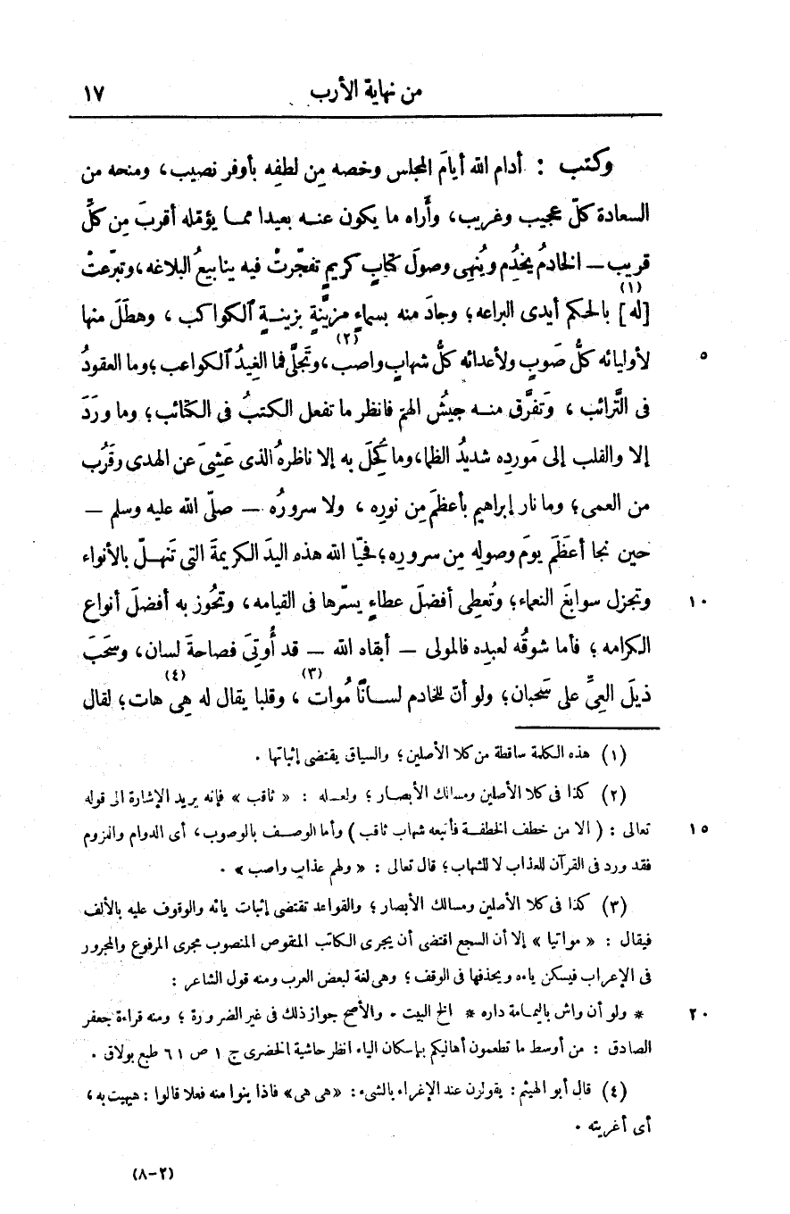 وكتب: أدام الله أيام المجلس وخصه من لطفه بأوفر نصيب، ومنحه من السعادة كلّ عجيب وغريب، وأراه ما يكون عنه بعيدا مما يؤمّله أقرب من كلّ قريب- الخادم يخدم وينهى وصول كتاب كريم تفجّرت فيه ينابيع البلاغه، وتبرّعت [له «1» ] بالحكم أيدى البراعه؛ وجاد منه بسماء مزينة بزينة الكواكب، وهطل منها لأوليائه كلّ صوب ولأعدائه كلّ شهاب واصب «2» ، وتجلّى فما الغيد الكواعب؛ وما العقود فى التّرائب، وتفرّق منه جيش الهمّ فانظر ما تفعل الكتب فى الكتائب؛ وما ورد إلا والقلب إلى مورده شديد الظما، وما كحل به إلا ناظره الذى عشى عن الهدى وقرب من العمى؛ وما نار إبراهيم بأعظم من نوره، ولا سروره- صلّى الله عليه وسلّم- حين نجا أعظم يوم وصوله من سروره؛ فحيّا الله هذه اليد الكريمة التى تنهلّ بالأنواء وتجزل سوابغ النعماء؛ وتعطى أفضل عطاء يسرّها فى القيامه، وتحوز به أفضل أنواع الكرامه؛ فأما شوقه لعبده فالمولى- أبقاه الله- قد أوتى فصاحة لسان، وسحب ذيل العىّ على سحبان؛ ولو أنّ للخادم لسانا موات «3» ، وقلبا يقال له هى «4» هات؛ لقال