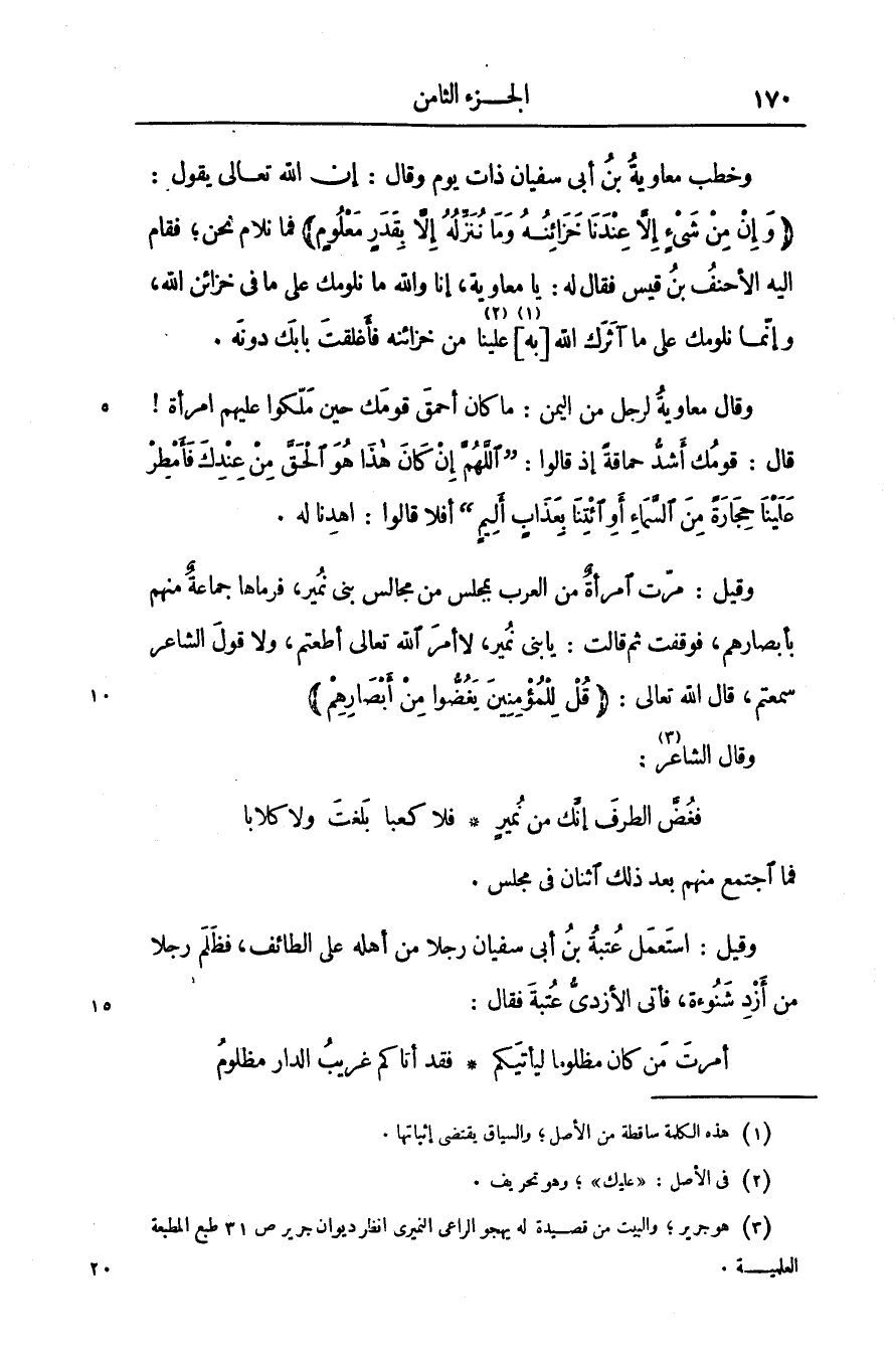فما نلام نحن؛ فقام اليه الأحنف بن قيس فقال له: يا معاوية، إنا والله ما نلومك على ما فى خزائن الله، وإنّما نلومك على ما آثرك الله [به «1» ] «2» علينا من خزائنه فأغلقت بابك دونه.