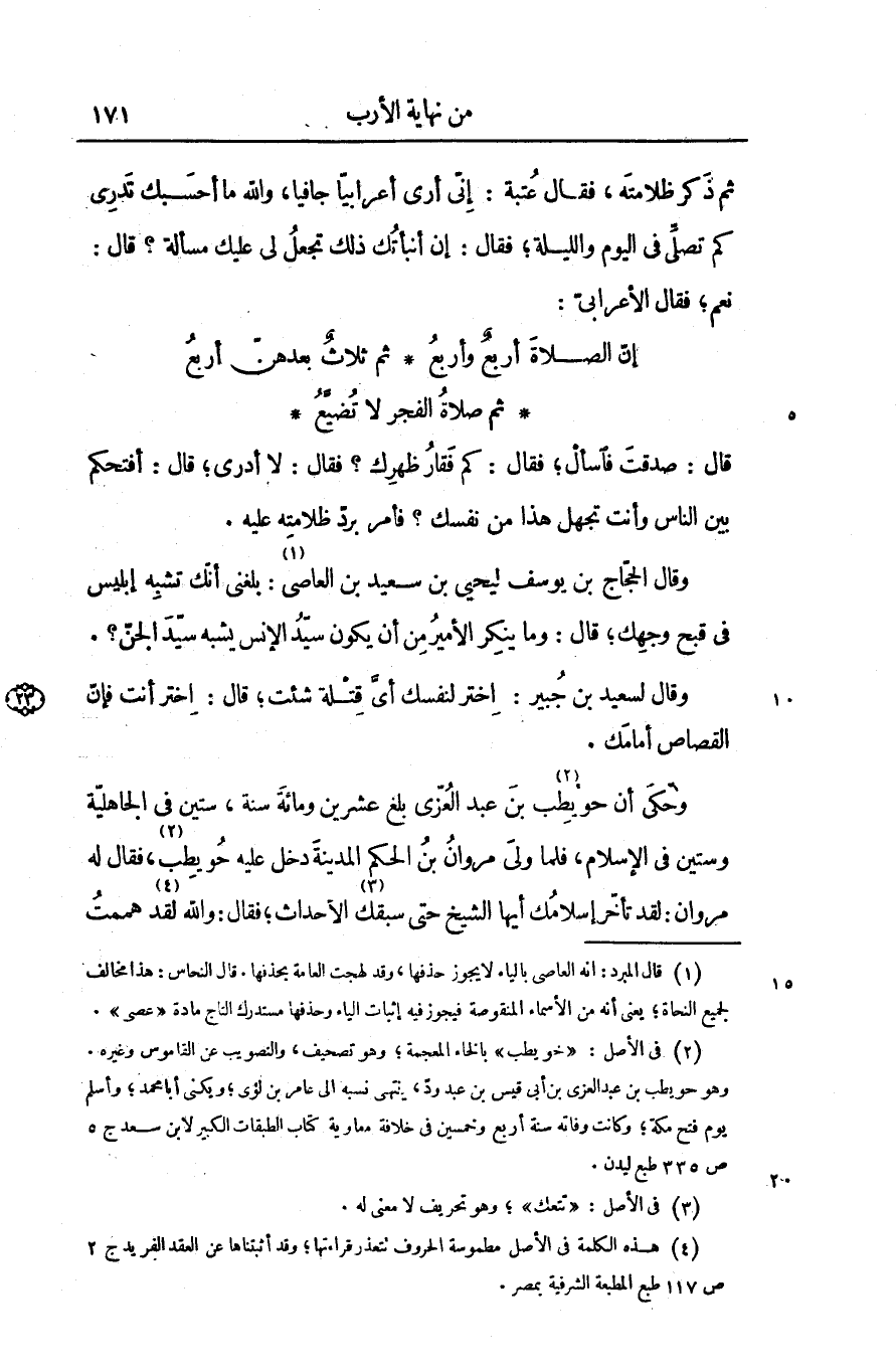 ثم ذكر ظلامته، فقال عتبة: إنّى أرى أعرابيّا جافيا، والله ما أحسبك تدرى كم تصلّى فى اليوم والليلة؛ فقال: إن أنبأتك ذلك تجعل لى عليك مسألة؟ قال: