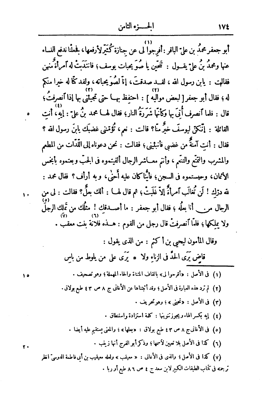 أبو جعفر محمد بن علىّ الباقر: أفرجوا «1» لى عن جنازة كثيّر لأرفعها، فجعلنا ندفع النساء عنها ومحمد بن علىّ يقول: تنحّين يا صويحبات يوسف؛ فانتدبت له امرأة منهن فقالت: يا بن رسول الله، لقد صدقت، إنّا لصويحباته، ولقد كنّا له خيرا منكم له؛ فقال أبو جعفر [لبعض مواليه «2» ] : احتفظ بها حتى تجيئنى «3» بها إذا انصرفت؛ قال: فلما انصرف أتى بها وكأنّها شررة النار؛ فقال لها محمد بن علىّ: إيه «4» ، أنت القائلة: إنّكنّ ليوسف خير منّا؟ قالت: نعم، تؤمّننى غضبك يا بن رسول الله؟