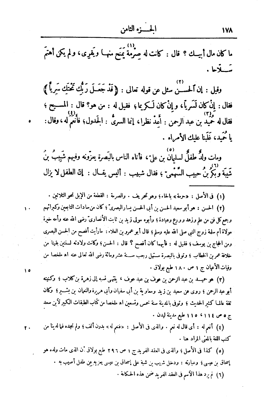 فقال: إن كان لسريّا، وإن كان لكريما؛ فقيل له: من هو؟ قال: المسيح؛ فقال له حميد «3» بن عبد الرحمن: أعد نظرا، إنما السرىّ: الجدول؛ فأنعم «4» له، وقال: