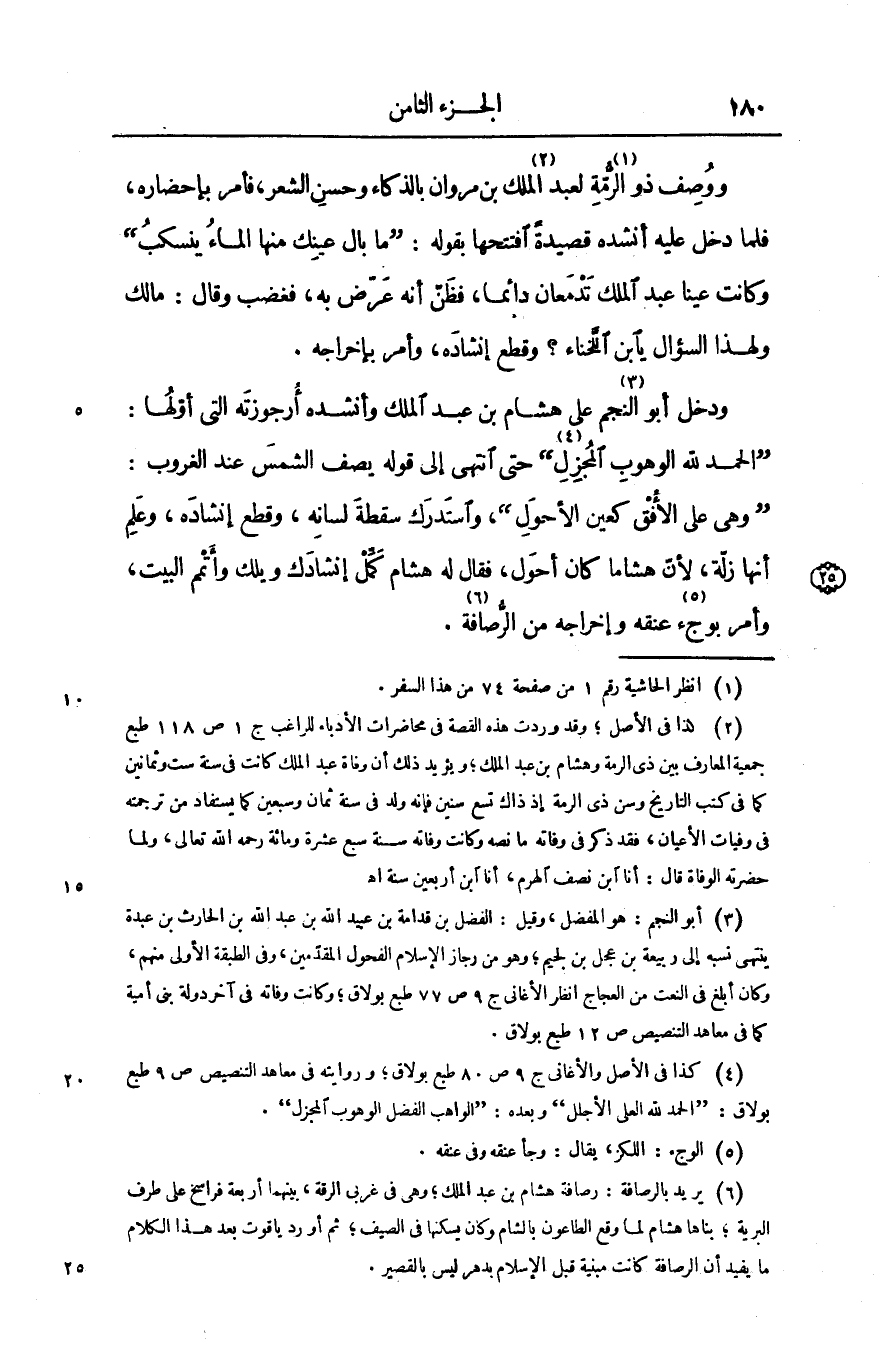 «وهى على الأفق كعين الأحول» ، واستدرك سقطة لسانه، وقطع إنشاده، وعلم أنها زلّة، لأنّ هشاما كان أحول، فقال له هشام كمّل إنشادك ويلك وأتمم البيت، وأمر بوجء «5» عنقه وإخراجه من الرّصافة «6» .