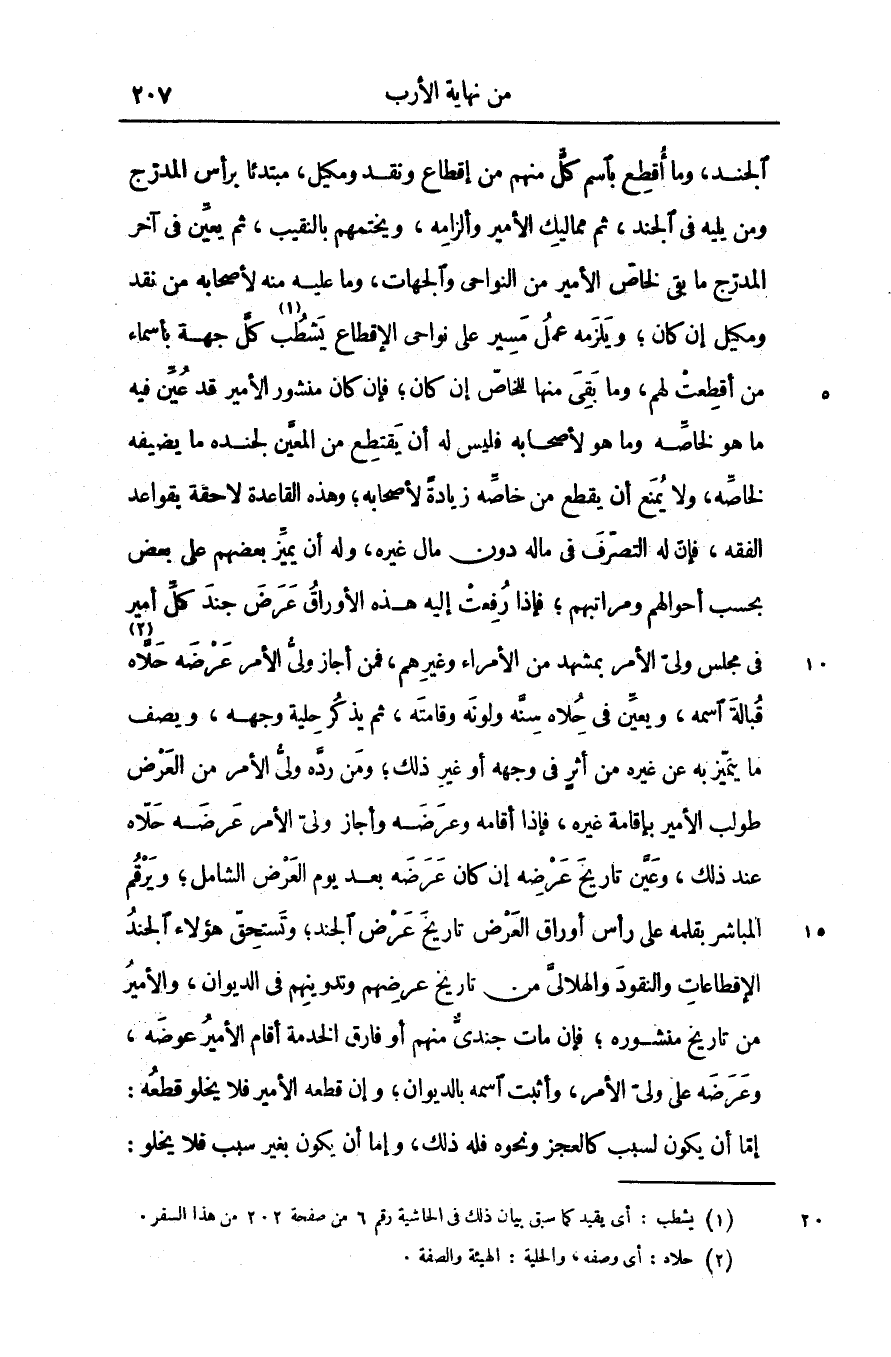 الجند، وما أقطع باسم كلّ منهم من إقطاع ونقد ومكيل، مبتدئا برأس المدرّج ومن يليه فى الجند، ثم مماليك الأمير وألزامه، ويختمهم بالنقيب، ثم يعيّن فى آخر المدرّج ما بقى الخاصّ الأمير من النواحى والجهات، وما عليه منه لأصحابه من نقد ومكيل إن كان؛ ويلزمه عمل مسير على نواحى الإقطاع يشطب «1» كلّ جهة بأسماء من أقطعت لهم، وما بقى منها للخاصّ إن كان فإن كان منشور الأمير قد عيّن فيه ما هو لخاصّه وما هو لأصحابه فليس له أن يقتطع من المعيّن لجنده ما يضيفه لخاصّه، ولا يمنع أن يقطع من خاصّه زيادة لأصحابه؛ وهذه القاعدة لاحقة بقواعد الفقه، فإنّ له التصرّف فى ماله دون مال غيره، وله أن يميّز بعضهم على بعض بحسب أحوالهم ومراتبهم؛ فإذا رفعت إليه هذه الأوراق عرض جند كلّ أمير فى مجلس ولىّ الأمر بمشهد من الأمراء وغيرهم، فمن أجاز ولىّ الأمر عرضه حلّاه «2» قبالة اسمه، ويعيّن فى حلاه سنّه ولونه وقامته، ثم يذكر حلية وجهه، ويصف ما يتميّز به عن غيره من أثر فى وجهه أو غير ذلك؛ ومن ردّه ولىّ الأمر من العرض طولب الأمير بإقامة غيره، فإذا أقامه وعرضه وأجاز ولىّ الأمر عرضه حلّاه عند ذلك، وعيّن تاريخ عرضه إن كان عرضه بعد يوم العرض الشامل؛ ويرقم المباشر بقلمه على رأس أوراق العرض تاريخ عرض الجند؛ وتستحقّ هؤلاء الجند الإقطاعات والنقود والهلالىّ من تاريخ عرضهم وتدوينهم فى الديوان، والأمير من تاريخ منشوره؛ فإن مات جندىّ منهم أو فارق الخدمة أقام الأمير عوضه، وعرضه على ولىّ الأمر، وأثبت اسمه بالديوان؛ وإن قطعه الأمير فلا يخلو قطعه: