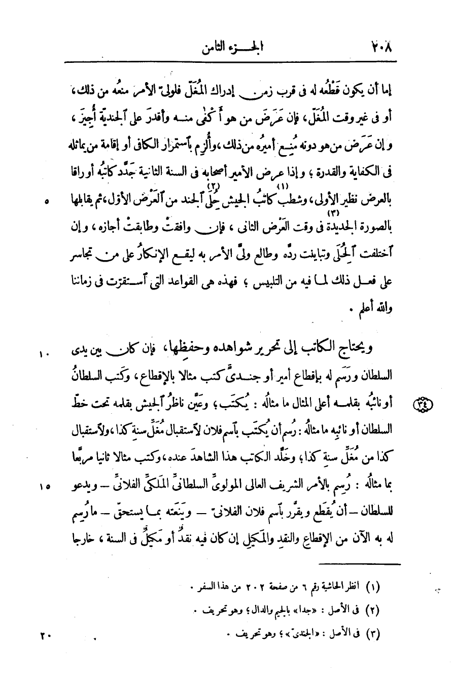 فإن كان بين يدى السلطان ورسم له بإقطاع أمير أو جندىّ كتب مثالا بالإقطاع، وكتب السلطان أو نائبه بقلمه أعلى المثال ما مثاله: يكتب؛ وعيّن ناظر الجيش بقلمه تحت خطّ السلطان أو نائبه ما مثاله: رسم أن يكتب باسم فلان لاستقبال مغلّ سنة كذا، ولاستقبال كذا من مغلّ سنة كذا؛ وخلّد الكاتب هذا الشاهد عنده، وكتب مثالا ثانيا مربّعا بما مثاله: رسم بالأمر الشريف العالى المولوىّ السلطانىّ الملكىّ الفلانىّ- ويدعو للسلطان- أن يقطع ويقرّر باسم فلان الفلانىّ- وينعته بما يستحقّ- ما رسم له به الآن من الإقطاع والنقد والمكيل إن كان فيه نقد أو مكيل فى السنة، خارجا
