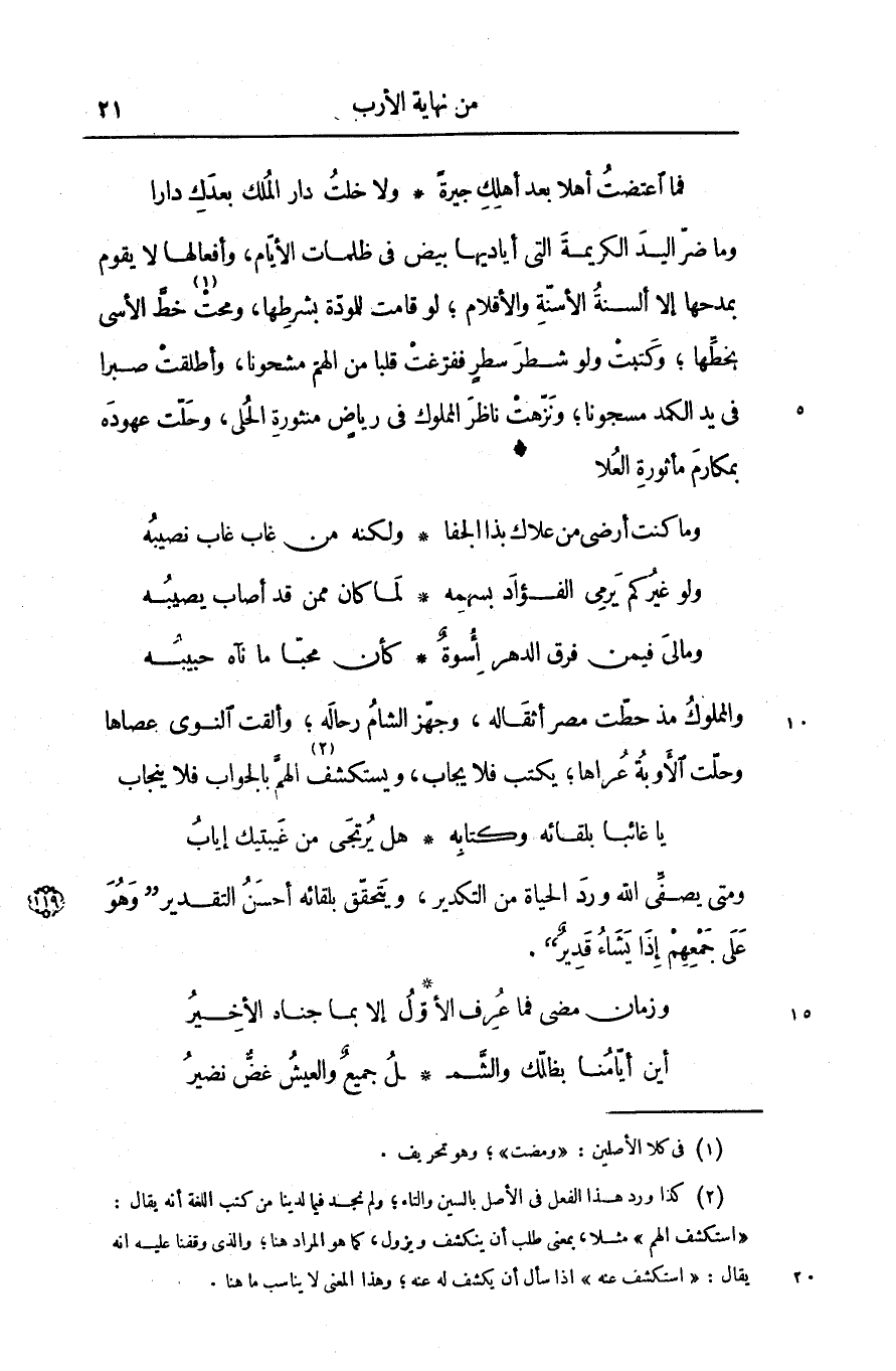 وما ضرّ اليد الكريمة التى أياديها بيض فى ظلمات الأيّام، وأفعالها لا يقوم بمدحها إلا ألسنة الأسنّة والأقلام؛ لو قامت للمودّة بشرطها، ومحت «1» خطّ الأسى بخطّها؛ وكتبت ولو شطر سطر ففرّغت قلبا من الهمّ مشحونا، وأطلقت صبرا فى يد الكمد مسجونا؛ ونزّهت ناظر المملوك فى رياض منثورة الحلى، وحلّت عهوده بمكارم مأثورة العلا
