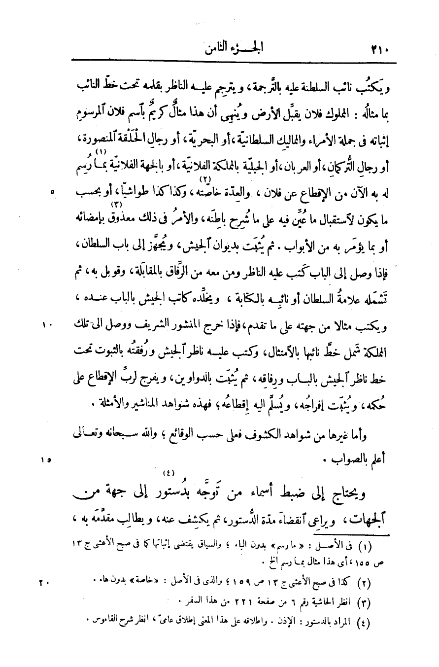 ويكتب نائب السلطنة عليه بالتّرجمة، ويترجم عليه الناظر بقلمه تحت خطّ النائب بما مثاله: المملوك فلان يقبّل الأرض وينهى أن هذا مثال كريم باسم فلان المرسوم إثباته فى جملة الأمراء والمماليك السلطانيّة، أو البحريّة، أو رجال الحلقة المنصورة، أو رجال التّركمان، أو العربان، أو الجبليّة بالمملكة الفلانيّة، أو بالجهة الفلانيّة «1» بما رسم له به الآن من الإقطاع عن فلان، والعدّة خاصّته «2» ، وكذا كذا طواشيا، أو بحسب ما يكون لاستقبال ما عيّن فيه على ما شرح باطنه، والأمر فى ذلك معذوق «3» بإمضائه أو بما يؤمر به من الأبواب. ثم يثبت بديوان الجيش، ويجهّز إلى باب السلطان، فإذا وصل إلى الباب كتب عليه الناظر ومن معه من الرّفاق بالمقابلة، وقوبل به، ثم تشمله علامة السلطان أو نائبه بالكتابة، ويخلّده كاتب الجيش بالباب عنده، ويكتب مثالا من جهته على ما تقدم، فإذا خرج المنشور الشريف ووصل الى تلك المملكة شمل خطّ نائبها بالامتثال، وكتب عليه ناظر الجيش ورفقته بالثبوت تحت خط ناظر الجيش بالباب ورفاقه، ثم يثبت بالدواوين، ويفرج لربّ الإقطاع على حكمه، ويثبت إفراجه، ويسلّم اليه إقطاعه؛ فهذه شواهد المناشير والأمثلة.