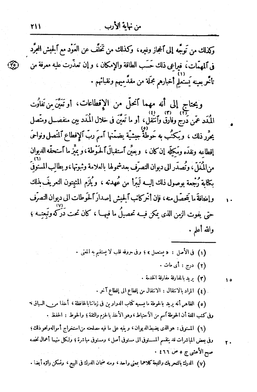 أو تعيّن من تفاوت المدد عمّن درج «2» وفارق «3» وانتقل «4» ، أو ما تعيّن فى خلال المدد بين منفصل ومتّصل يحرّر ذلك، ويكتب به حوطة «5» جيشيّة يضمّنها اسم ربّ الإقطاع المتّصل ونواحى إقطاعه ونقده ومكيله إن كان، ويعيّن استقبال الحوطة، ويميّز ما استحقّه الديوان من المغلّ، وتصدر الى ديوان التصرّف بعد شمولها بالعلامة وثبوتها، ويطالب المستوفى «6» بكتابة رجعة بوصول ذلك إليه ليبرأ من عهدته، ويلزم المثبتون التعريف بذلك وإضافة ما يتحصّل منه، فإن أخّر كاتب الجيش إصدار الحوطات الى ديوان التصرّف حتى يفوت الزمن الذى يمكن فيه تحصيل ما فيها، كان تحت دركه «7» وتبعته؛ والله أعلم.