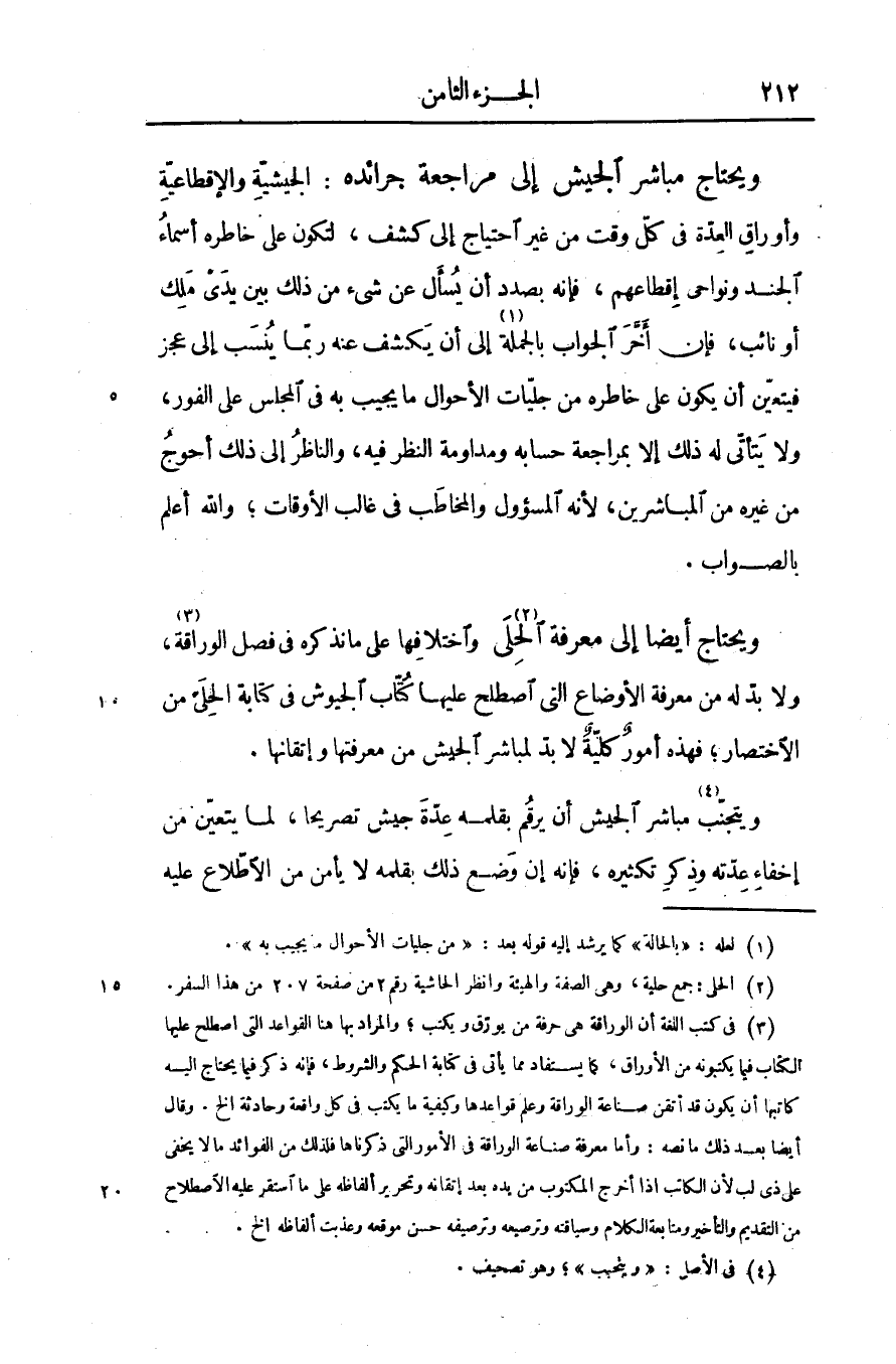 ويتجنّب «4» مباشر الجيش أن يرقم بقلمه عدّة جيش تصريحا، لما يتعيّن من إخفاء عدّته وذكر تكثيره، فإنه إن وضع ذلك بقلمه لا يأمن من الاطّلاع عليه