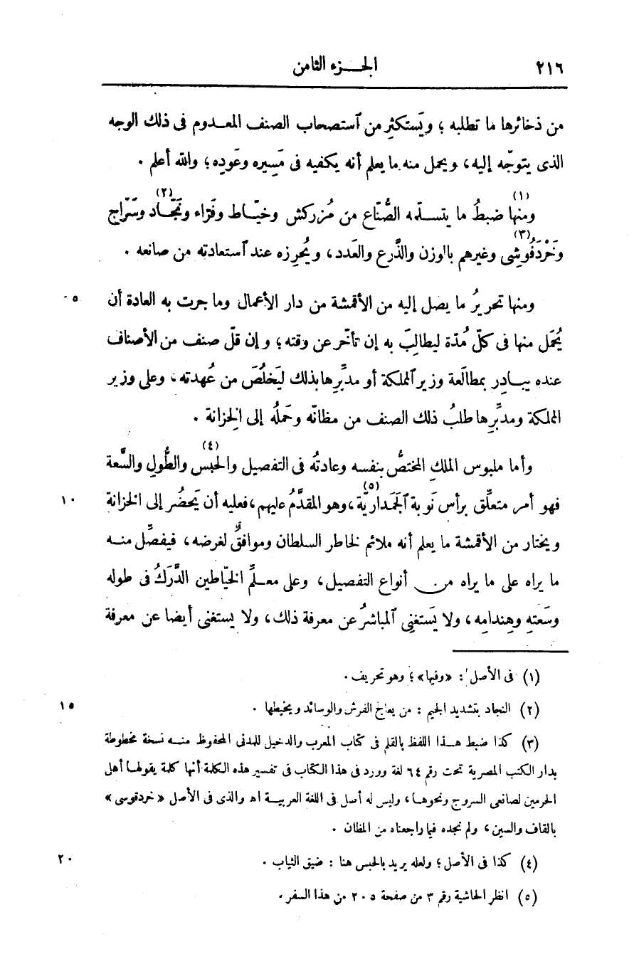 وأما ملبوس الملك المختصّ بنفسه وعادته فى التفصيل والحبس «4» والطّول والسّعة فهو أمر متعلّق برأس نوبة الجمداريّة «5» ، وهو المقدّم عليهم، فعليه أن يحضر إلى الخزانة ويختار من الأقمشة ما يعلم أنه ملائم لخاطر السلطان وموافق لغرضه، فيفصّل منه ما يراه على ما يراه من أنواع التفصيل، وعلى معلّم الخيّاطين الدّرك فى طوله وسعته وهندامه، ولا يستغنى المباشر عن معرفة ذلك، ولا يستغنى أيضا عن معرفة