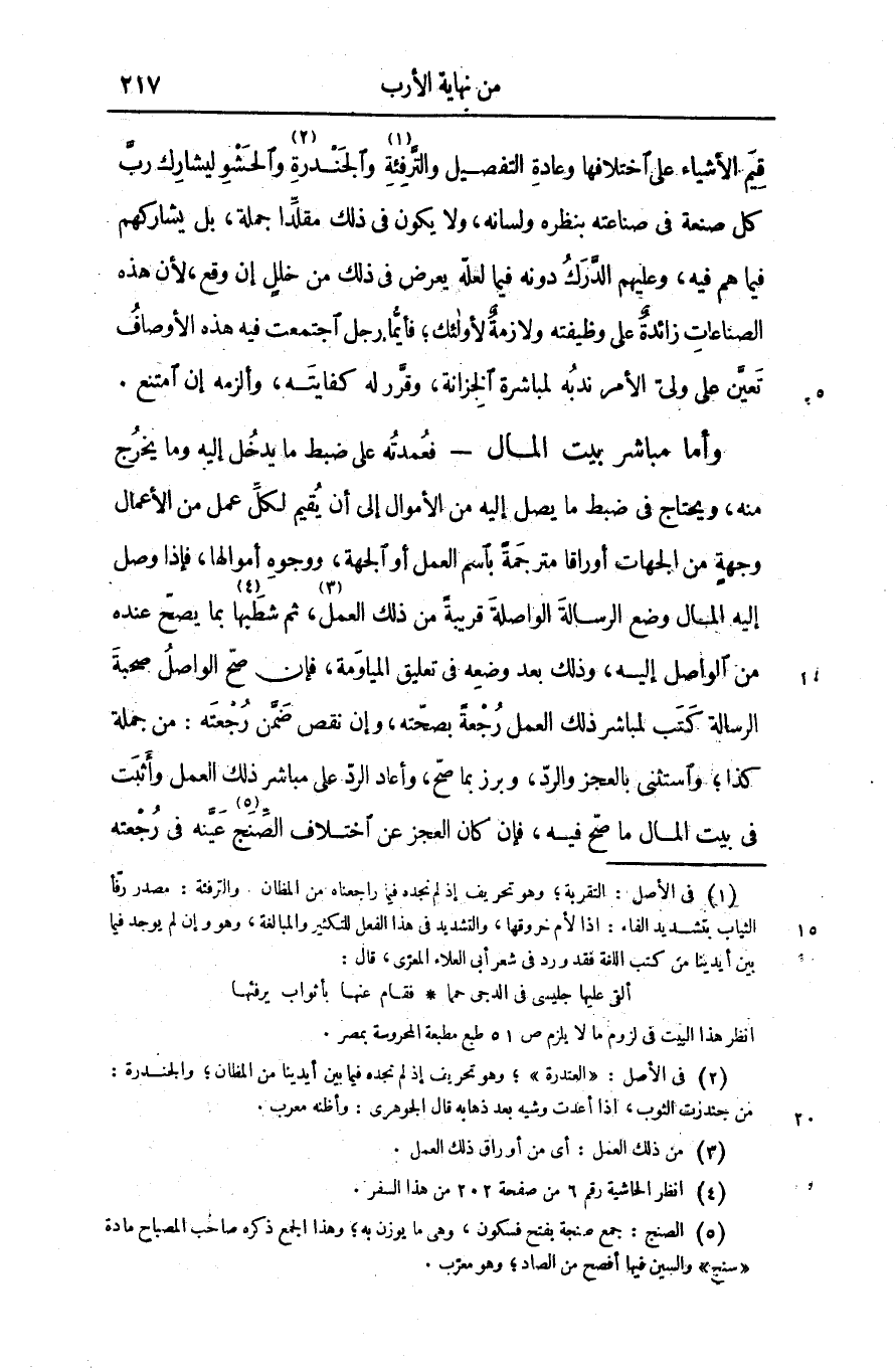 قيم الأشياء على اختلافها وعادة التفصيل والتّرفئة «1» والجندرة «2» والحشو ليشارك ربّ كل صنعة فى صناعته بنظره ولسانه، ولا يكون فى ذلك مقلّدا جملة، بل يشاركهم فيما هم فيه، وعليهم الدّرك دونه فيما لعلّه يعرض فى ذلك من خلل إن وقع، لأن هذه الصناعات زائدة على وظيفته ولازمة لأولئك؛ فأيّما رجل اجتمعت فيه هذه الأوصاف تعيّن على ولىّ الأمر ندبه لمباشرة الخزانة، وقرّر له كفايته، وألزمه إن امتنع.