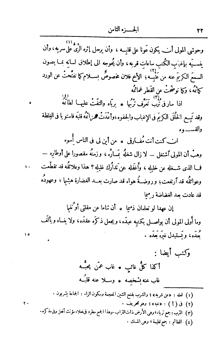 وهب أن المولى اشتغل- لا زال شغله بمسارّه، وزمنه مقصورا على أوطاره- فما الذى شغله عن خليله، وأغفله عن تدارك غليله؟ هذا وعلائقه قد تقطّعت وعوائقه قد ارتفعت؛ وروضة هواه قد صارت بعد الغضارة هشيما، وعهوده قد عادت بعد الغضاضة رميما