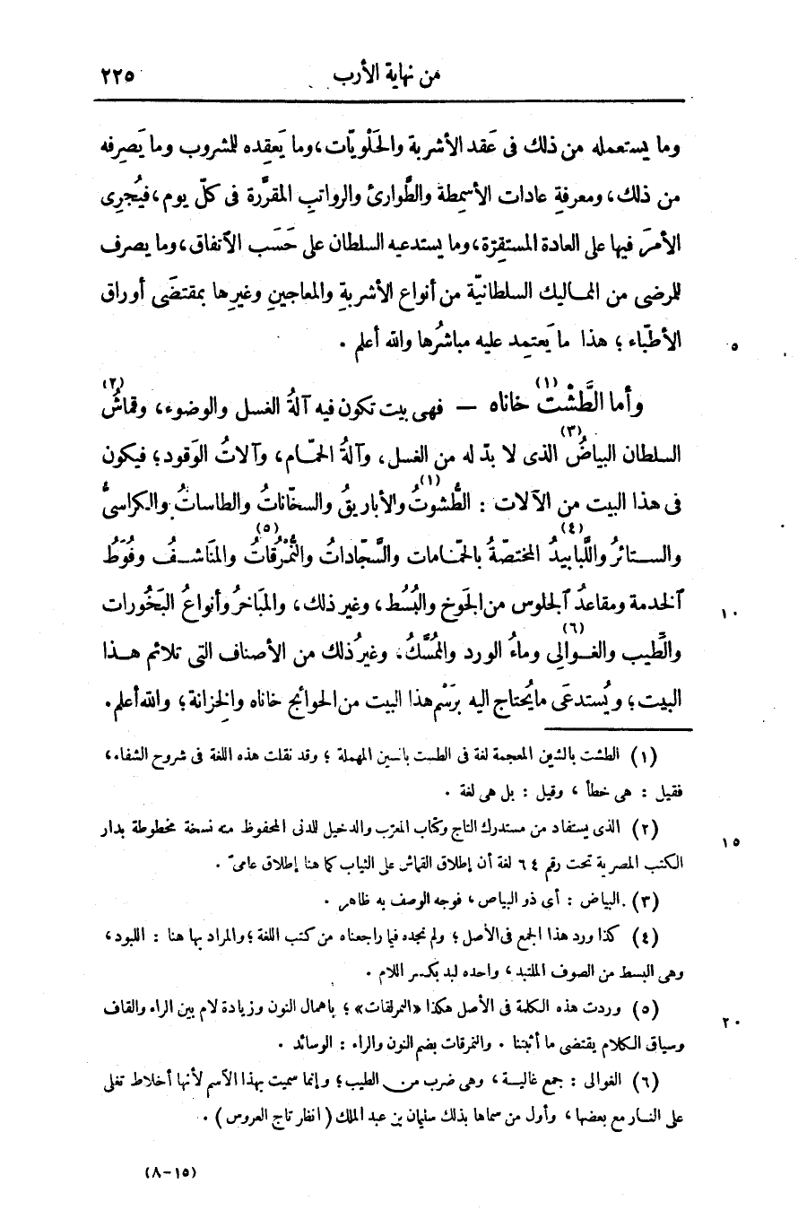 - فهى بيت تكون فيه آلة الغسل والوضوء، وقماش «2» السلطان البياض «3» الذى لا بدّ له من الغسل، وآلة الحمّام، وآلات الوقود؛ فيكون فى هذا البيت من الآلات: الطّشوت والأباريق والسخّانات والطاسات والكراسىّ والستائر واللّبابيد «4» المختصّة بالحمّامات والسّجادات والنّمرقات «5» والمناشف وفوط الخدمة ومقاعد الجلوس من الجوخ والبسط، وغير ذلك، والمباخر وأنواع البخورات والطّيب والغوالى «6» وماء الورد والممسّك، وغير ذلك من الأصناف التى تلائم هذا البيت؛ ويستدعى ما يحتاج اليه برسم هذا البيت من الحوائج خاناه والخزانة؛ والله أعلم.