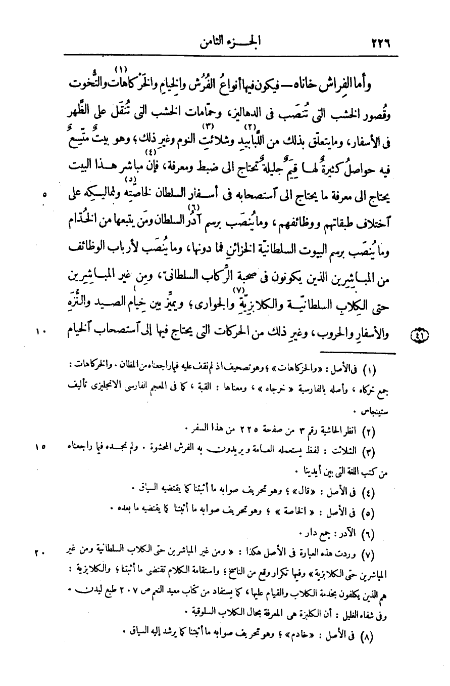 - فيكون فيها أنواع الفرش والخيام والخركاهات «1» والتّخوت وقصور الخشب التى تنصب فى الدهاليز، وحمّامات الخشب التى تنقل على الظّهر فى الأسفار، وما يتعلّق بذلك من اللّبابيد «2» وشلائت «3» النوم وغير ذلك؛ وهو بيت متّسع فيه حواصل كثيرة لها قيم جليلة تحتاج الى ضبط ومعرفة، فإن «4» مباشر هذا البيت يحتاج الى معرفة ما يحتاج الى استصحابه فى أسفار السلطان لخاصّته «5» ولمماليكه على اختلاف طبقاتهم ووظائفهم، وما ينصب برسم آدر «6» السلطان ومن يتبعها من الخدّام وما ينصب برسم البيوت السلطانيّة الخزائن فما دونها، وما ينصب لأرباب الوظائف من المباشرين الذين يكونون فى صحبة الرّكاب السلطانىّ، ومن غير المباشرين الذين يكونون فى صحبة الرّكاب السلطانىّ، ومن غير المباشرين حتى الكلاب السلطانيّة والكلابزيّة «7» والجوارى؛ ويميّز بين خيام «8» الصيد والنّزه والأسفار والحروب، وغير ذلك من الحركات التى يحتاج فيها إلى استصحاب الخيام