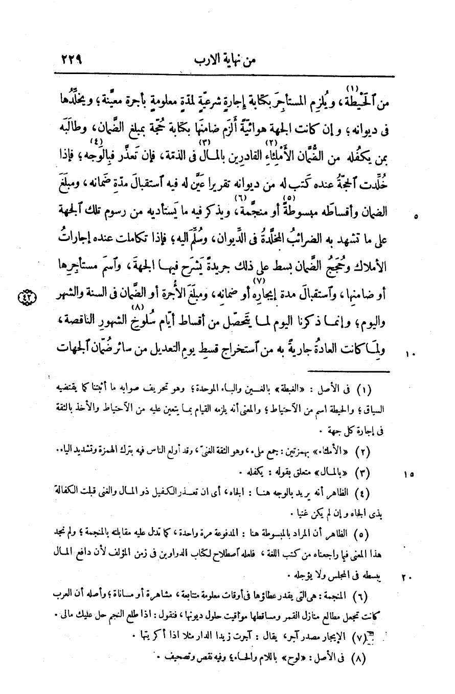 من الحيطة «1» ، ويلزم المستأجر بكتابة إجارة شرعيّة لمدّة معلومة بأجرة معيّنة؛ ويخلّدها فى ديوانه؛ وإن كانت الجهة هوائيّة ألزم ضامنها بكتابة حجّة بمبلغ الضّمان، وطالبه بمن يكفله من الضّمّان الأملئاء «2» القادرين بالمال «3» فى الذمّة، فإن تعذّر فبالوجه «4» ؛ فإذا خلّدت الحجّة عنده كتب له من ديوانه تقريرا عيّن له فيه استقبال مدّة ضمانه، ومبلغ الضمان وأقساطه مبسوطة «5» أو منجّمة «6» ، ويذكر فيه ما يستأديه من رسوم تلك الجهة على ما تشهد به الضرائب المخلّدة فى الدّيوان، وسلّم اليه؛ فإذا تكاملت عنده إجارات الأملاك وحجج الضّمان بسط على ذلك جريدة يشرح فيها الجهة، واسم مستأجرها أو ضامنها، واستقبال مدة إيجاره «7» أو ضمانه، ومبلغ الأجرة أو الضّمان فى السنة والشهر واليوم؛ وإنما ذكرنا اليوم لما يتحصّل من أقساط أيّام سلوخ «8» الشهور الناقصة، ولما كانت العادة جارية به من استخراج قسط يوم التعديل من سائر ضمّان الجهات