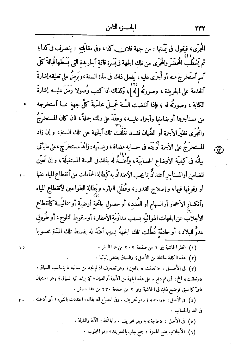 المجرى، فيقول فى يمنتها: من جهة فلان كذا، وفى مقابلته: ينصرف فى كذا؛ ثم يشطب «1» المحضر والمجرى من تلك الجهة فى يسرة قائمة الجريدة التى بسطها قبالة كلّ اسم استخرج منه أو أجرى عليه، يفعل ذلك فى مدّة السنة، ويرمز على تعليقه إشارة الخدمة على الجريدة، وصورته [له «2» ] ؛ وكذلك اذا كتب وصولا رمز عليه إشارة الكتابة، وصورته له؛ فإذا انقضت السّنة عمل محاسبة كلّ جهة بما استخرجه من مستأجرها أو ضامنها وأجراه عليه، وعقد على ذلك جملة، فان كان المستخرج والمجرى نظير الأجرة أو الضّمان فقد تغلّقت «3» تلك الجهة عن تلك السنة، وإن زاد المستخرج على الأجرة أورده فى حسابه مضافا، ويسمّيه: زائد مستخرج، على ما يأتى بيانه فى كيفيّة الأوضاع الحسابيّة، واعتدّ «4» له بذلك فى السنة المستقبلة؛ وإن تعيّن للضامن أو المستأجر اعتداد بما يجب الاعتداد به كباطلة الحمّامات من انقطاع المياه عنها أو وقوفها فيها، وإصلاح القدور، وعطل العمائر، وبطالة الطواحين لانقطاع المياه وانكسار الأحجار أو السهام أو العدد، أو حصول جائحة «5» أرضيّة أو سمائيّة كانقطاع الأجلاب «6» عن الجهات الهوائيّة بسبب مداومة الأمطار، أو سقوط الثلوج، أو طروق عدوّ للبلاد، أو حادثة عطّلت تلك الجهة بسببها اعتدّ له بقسط تلك المدّة محسوبا