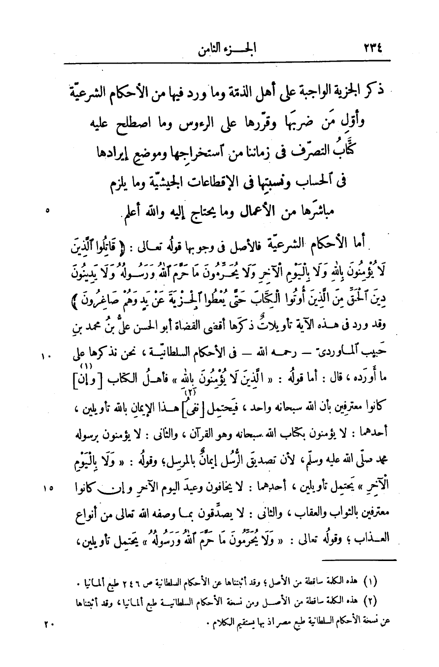 وقد ورد فى هذه الآية تأويلات ذكرها أقضى القضاة أبو الحسن علىّ بن محمد بن حبيب الماوردىّ- رحمه الله- فى الأحكام السلطانيّة، نحن نذكرها على ما أورده، قال: أما قوله: «الّذين لا يؤمنون بالله» فأهل الكتاب [وإن «1» ] كانوا معترفين بأن الله سبحانه واحد، فيحتمل [نفى «2» ] هذا الإيمان بالله تأويلين، أحدهما: لا يؤمنون بكتاب الله سبحانه وهو القرآن، والثانى: لا يؤمنون برسوله محمد صلّى الله عليه وسلّم، لأن تصديق الرّسل إيمان بالمرسل؛ وقوله: «وَلا بِالْيَوْمِ الْآخِرِ» *