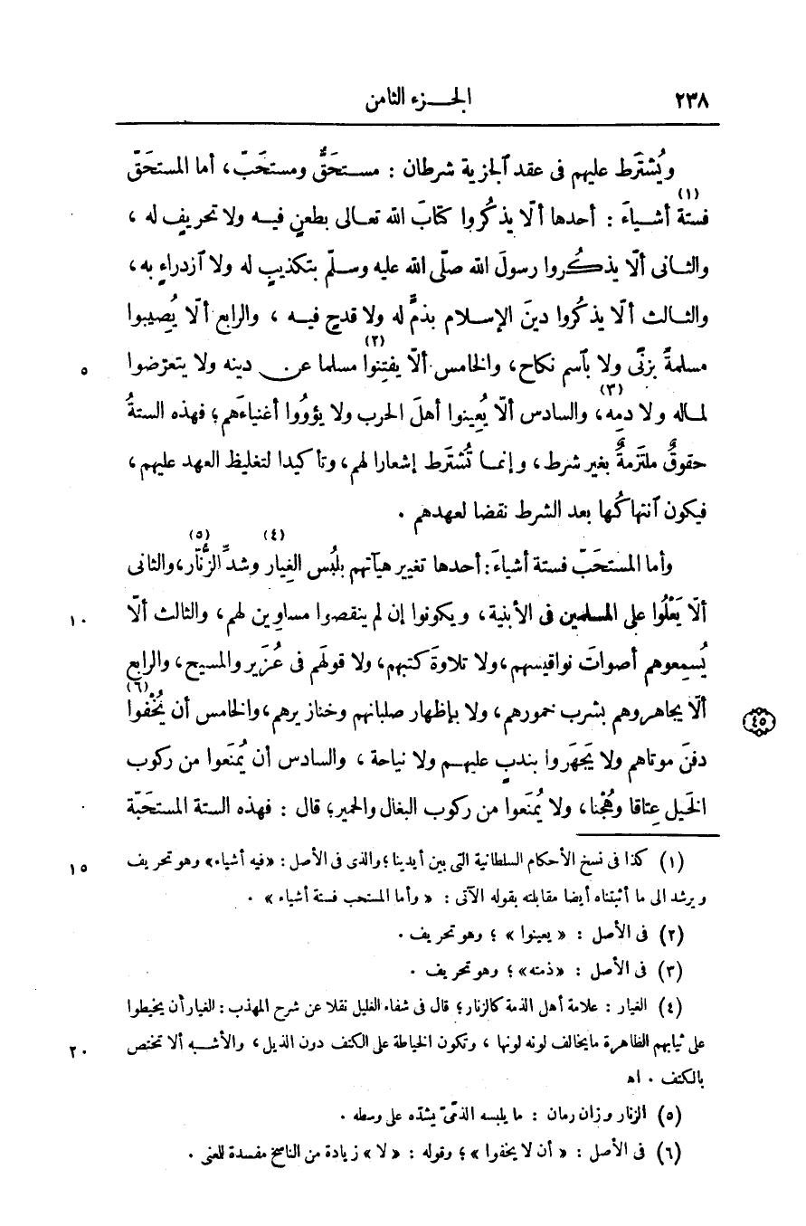 ويشترط عليهم فى عقد الجزية شرطان: مستحقّ ومستحبّ، أما المستحقّ فستة «1» أشياء: أحدها ألّا يذكروا كتاب الله تعالى بطعن فيه ولا تحريف له، والثانى ألّا يذكروا رسول الله صلّى الله عليه وسلّم بتكذيب له ولا ازدراء به، والثالث ألّا يذكروا دين الإسلام بذمّ له ولا قدح فيه، والرابع ألّا يصيبوا مسلمة بزنى ولا باسم نكاح، والخامس ألّا يفتنوا «2» مسلما عن دينه ولا يتعرّضوا لماله ولا دمه «3» ، والسادس ألّا يعينوا أهل الحرب ولا يؤووا أغنياءهم؛ فهذه الستة حقوق ملتزمة بغير شرط، وإنما تشترط إشعارا لهم، وتأكيدا لتغليظ العهد عليهم، فيكون انتهاكها بعد الشرط نقضا لعهدهم.