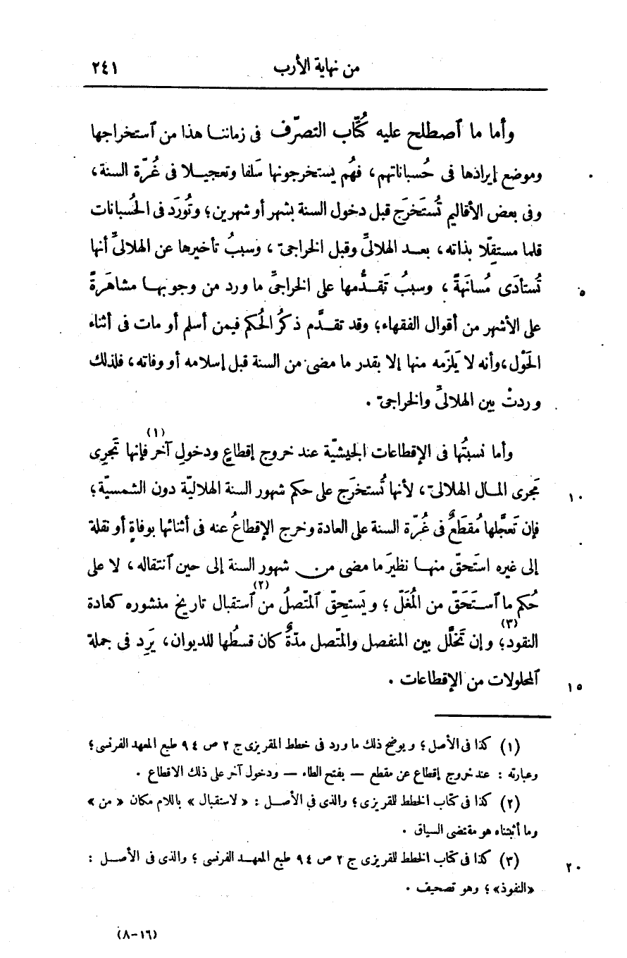 فى زماننا هذا من استخراجها وموضع إيرادها فى حسباناتهم، فهم يستخرجونها سلفا وتعجيلا فى غرّة السنة، وفى بعض الأقاليم تستخرج قبل دخول السنة بشهر أو شهرين؛ وتورد فى الحسبانات قلما مستقلّا بذاته، بعد الهلالىّ وقبل الخراجىّ، وسبب تأخيرها عن الهلالىّ أنها تستأدى مسانهة، وسبب تقدّمها على الخراجىّ ما ورد من وجوبها مشاهرة على الأشهر من أقوال الفقهاء؛ وقد تقدّم ذكر الحكم فيمن أسلم أو مات فى أثناء الحول، وأنه لا يلزمه منها إلا بقدر ما مضى من السنة قبل إسلامه أو وفاته، فلذلك وردت بين الهلالىّ والخراجىّ.