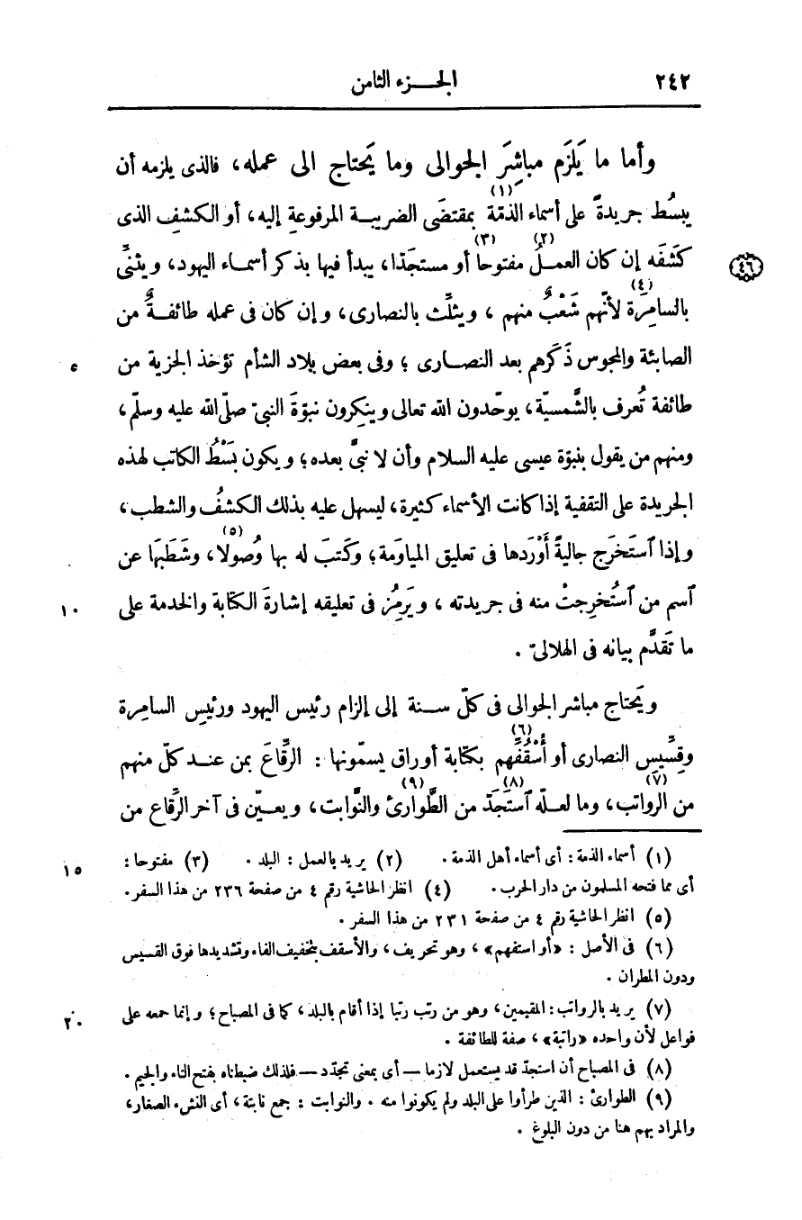 ويحتاج مباشر الجوالى فى كلّ سنة إلى إلزام رئيس اليهود ورئيس السامرة وقسّيس النصارى أو أسقفّهم «6» بكتابة أوراق يسمّونها: الرّقاع بمن عند كلّ منهم من الرواتب «7» ، وما لعلّه استجدّ «8» من الطّوارئ «9» والنّوابت، ويعيّن فى آخر الرّقاع من