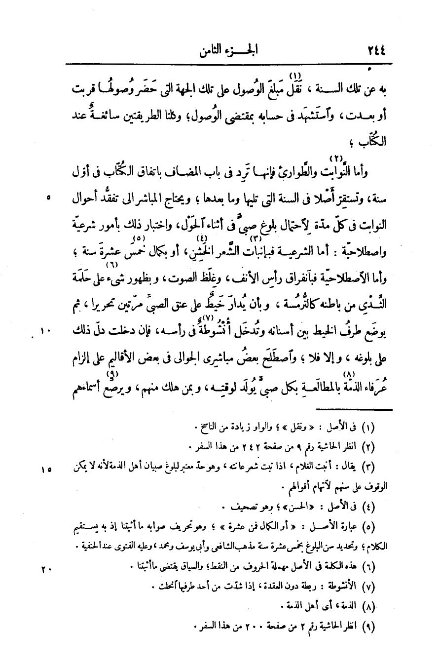 فإنها ترد فى باب المضاف باتفاق الكتّاب فى أوّل سنة، وتستقرّ أصلا فى السنة التى تليها وما بعدها؛ ويحتاج المباشر الى تفقّد أحوال النوابت فى كلّ مدّة لاحتمال بلوغ صبىّ فى أثناء الحول، واختبار ذلك بأمور شرعيّة واصطلاحيّة: أما الشرعية فبإنبات «3» الشّعر الخشن «4» ، أو بكمال خمس «5» عشرة سنة؛ وأما اصطلاحيّة فبانفراق رأس الأنف، وغلظ الصوت، وبظهور شىء «6» على حلمة الثّدى من باطنه كالتّرمسة، وبأن يدار خيط على عنق الصبىّ مرّتين تحريرا، ثم يوضع طرف الخيط بين أسنانه وتدخل أنشوطة «7» فى رأسه، فإن دخلت دلّ ذلك على بلوغه، وإلا فلا؛ واصطلح بعض مباشرى الجوالى فى بعض الأقاليم على إلزام عرفاء الذمّة «8» بالمطالعة بكل صبىّ يولد لوقته، وبمن هلك منهم، ويرصّع «9» أسماءهم
