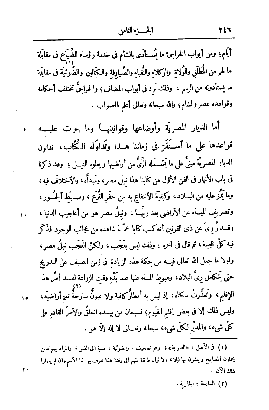 فقانون الديار المصريّة مبنىّ على ما يشمله الرّى من أراضيها ويعلوه النيل؛ وقد ذكرنا فى باب الأنهار فى الفن الأوّل من كتابنا هذا نيل مصر، ومبدأه، والاختلاف فيه، وما يمرّ عليه من البلاد، وكيفيّة الانتفاع به من حفر التّرع، وضبط الجسور، وتصريف المياه عن الأراضى بعد ريّها؛ ونيل مصر هو من أعاجيب الدنيا، وقد روى عن ذى القرنين أنه كتب كتابا عمّا شاهده من عجائب الوجود فذكر فيه كلّ عجيبة، ثم قال فى آخره: وذلك ليس بعجب، ولكنّ العجب نيل مصر، ولولا ما جعل الله تعالى فيه من حكمة هذه الزيادة فى زمن الصيف على التدريج حتى يتكامل رىّ البلاد، وهبوط الماء عنها عند بدء وقت الزراعة لفسد أمر هذا الإقليم، وتعذّرت سكناه، إذ ليس به أمطار كافية ولا عيون سارحة «2» تعمّ أراضيه، وليس ذلك إلا فى بعض إقليم الفيّوم؛ فسبحان من بيده الخلق والأمر القادر على كلّ شىء، والمدبّر لكلّ شىء، سبحانه وتعالى لا إله إلّا هو.