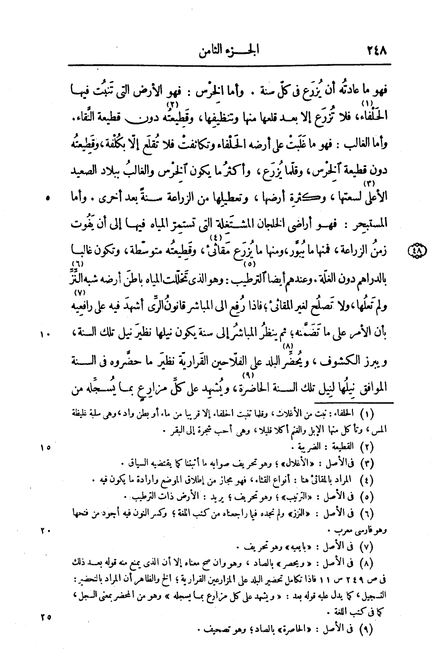 وأما الغالب: فهو ما غلبت على أرضه الحلفاء وتكاثفت فلا تقلع إلّا بكلفة، وقطيعته دون قطيعة الخرس، وقلّما يزرع، وأكثر ما يكون الخرس والغالب ببلاد الصعيد الأعلى «3» لسعتها، وكثرة أرضها، وتعطيلها من الزراعة سنة بعد أخرى. وأما المستبحر: فهو أراضى الخلجان المشتغلة التى تستمرّ المياه فيها إلى أن يفوت زمن الزراعة، فمنها ما يبوّر، ومنها ما يزرع مقاثئ «4» ، وقطيعته متوسّطة، وتكون غالبا بالدراهم دون الغلّة. وعندهم أيضا الترطيب «5» : وهو الذى تخلّلت المياه باطن أرضه شبه النّزّ «6» ولم تعلها، ولا تصلح لغير المقاثئ؛ فاذا رفع الى المباشر قانون الرّى أشهد فيه على رافعيه «7» بأن الأمر على ما تضمّنه؛ ثم ينظر المباشر إلى سنة يكون نيلها نظير نيل تلك السنة، ويبرز الكشوف، ويحضّر البلد «8» البلد على الفلّاحين القراريّة نظير ما حضّروه فى السنة الموافق نيلها لنيل تلك السنة الحاضرة «9» ، ويشهد على كلّ مزارع بما يسجّله من