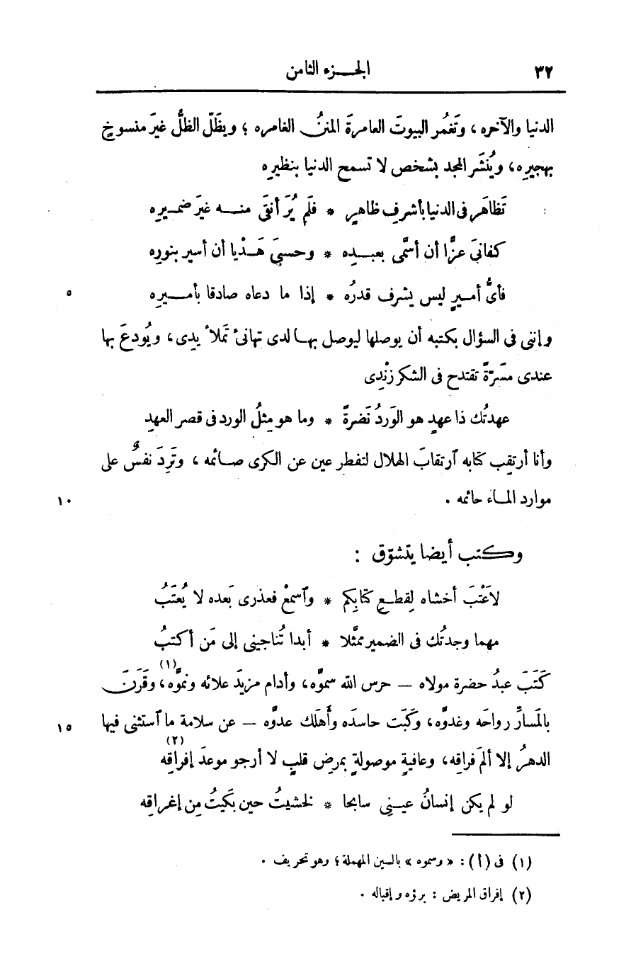 وإننى فى السؤال بكتبه أن يوصلها ليوصل بها لدى تهانئ تملأ يدى، ويودع بها عندى مسرّة تقتدح فى الشكر زندى