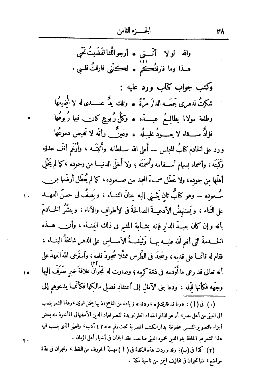 ورد على الخادم كتاب المجلس- أعلى الله سلطانه وأثبته، وأرغم أنف عدوّه وكبته، وأصماه بسهام أسقامه وأصمته؛ ولا أخلى الدنيا من وجوده، كما لم يخل أهلها من جوده، ولا عطّل سماء المجد من صعوده، كما لم يعطّل أرضها من سعوده- وهو كتاب ثان يثنى إليه عنان الثناء، ويصف لى حسن العهد على التّناء، ويستنهض الأدعية الصالحة فى الأطراف والآناء، ويبشّر الخادم بأنه وإن كان بعيد الدار فإنه بمثابة المقيم فى ذلك الفناء، وأن هذه الخدمة التى أنعم الله عليه بها وثيقة الأساس على الدهر شامخة البناء؛ فقام له قائما على قدمه، وسجد فى الطّرس ممثّلا سجود قلمه، واسترعى الله العهد على أنه تعالى قد رعى ما أودعه فى ذمّة كرمه؛ وصارت له نجران «2» علاقة خير صرف إليها وجهه فكأنها قبله، ودعا بنى الآمال إلى اعتقاد فضل مالكها فكأنّما يدعوهم إلى