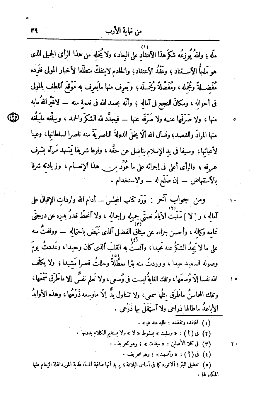 ملّه؛ والله يوزعه شكر هذا الافتقاد «1» على البعاد، ولا يخله من هذا الرأى الجميل الذى هو ملجأ الاستناد؛ وعقد الاعتقاد؛ والخادم لا ينفكّ متطلّعا لأخبار المولى فترده مفضلة ومجمله، ومفصّلة ومجمله؛ ويعرف منها ما يعرف به موقع اللطف بالمولى فى أحواله، ومكان النجح فى آماله؛ وأنّه بحمد الله فى نعمة منه- لا غيّر الله ما به منها، ولا صرفها عنه ولا صرفه عنها- فيجدّد لله الشكر والحمد، ويبلّغه ما يبلغه منها المراد والقصد؛ ونسأل الله ألّا يخلى الدولة الناصريّة منه ناصرا لسلطانها، وعينا لأعيانها؛ وسيفا فى يد الإسلام يناضل عن حقّه، وفرعا شريفا يشهد مرآه بشرف عرقه؛ والرأى أعلى فى إجرائه على ما عوّد من هذا الإنعام، وزيادته شرفا بالاستنهاض- إن صلح له- والاستخدام.