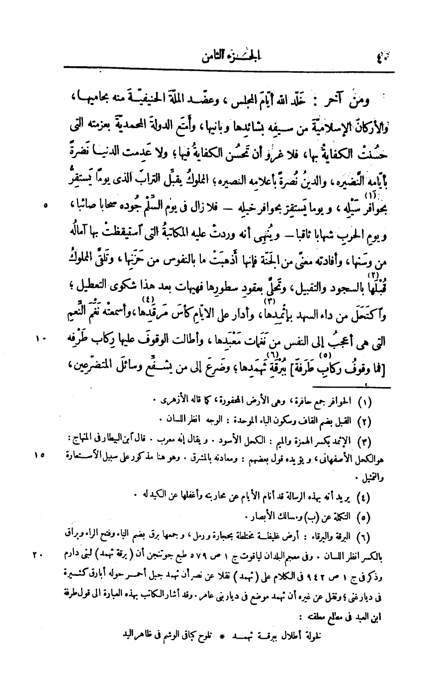 ومن آخر: خلّد الله أيّام المجلس، وعضّد الملّة الحنيفيّة منه بحاميها، والأركان الإسلاميّة من سيفه بشائدها وبانيها، وأمتع الدولة المحمديّة بعزمته التى حسنت الكفاية بها، فلا غرو أن تحسن الكفاية فيها؛ ولا عدمت الدنيا نضرة بأيّامه النّضيره، والدين نصرة بأعلامه النصيره؛ المملوك يقبّل التراب الذى يوما يستقرّ بحوافر «1» سيله، ويوما يستقرّ بحوافر خيله- فلا زال فى يوم السلم جوده سحابا صائبا، ويوم الحرب شهابا ثاقبا- وينهى أنه وردت عليه المكاتبة التى استيقظت بها آماله من وسنها، وأفادته معنى من الجنّة فإنها أذهبت ما بالنفوس من حزنها، وتلقّى المملوك قبلها «2» بالسجود والتقبيل، وتحلّى بعقود سطورها فهيهات بعد هذا شكوى التعطيل؛ واكتحل من داء السهد بإثمدها «3» ، وأدار على الايّام كأس مرقدها «4» ، وأسمعته نغم النّعم التى هى أعجب إلى النفس من نغمات معبدها، وأطالت الوقوف عليها ركاب طرفه [فما وقوف ركاب «5» طرفة] ببرقة «6» ثهمدها؛ وضرع إلى من يشفّع وسائل المتضرّعين،
