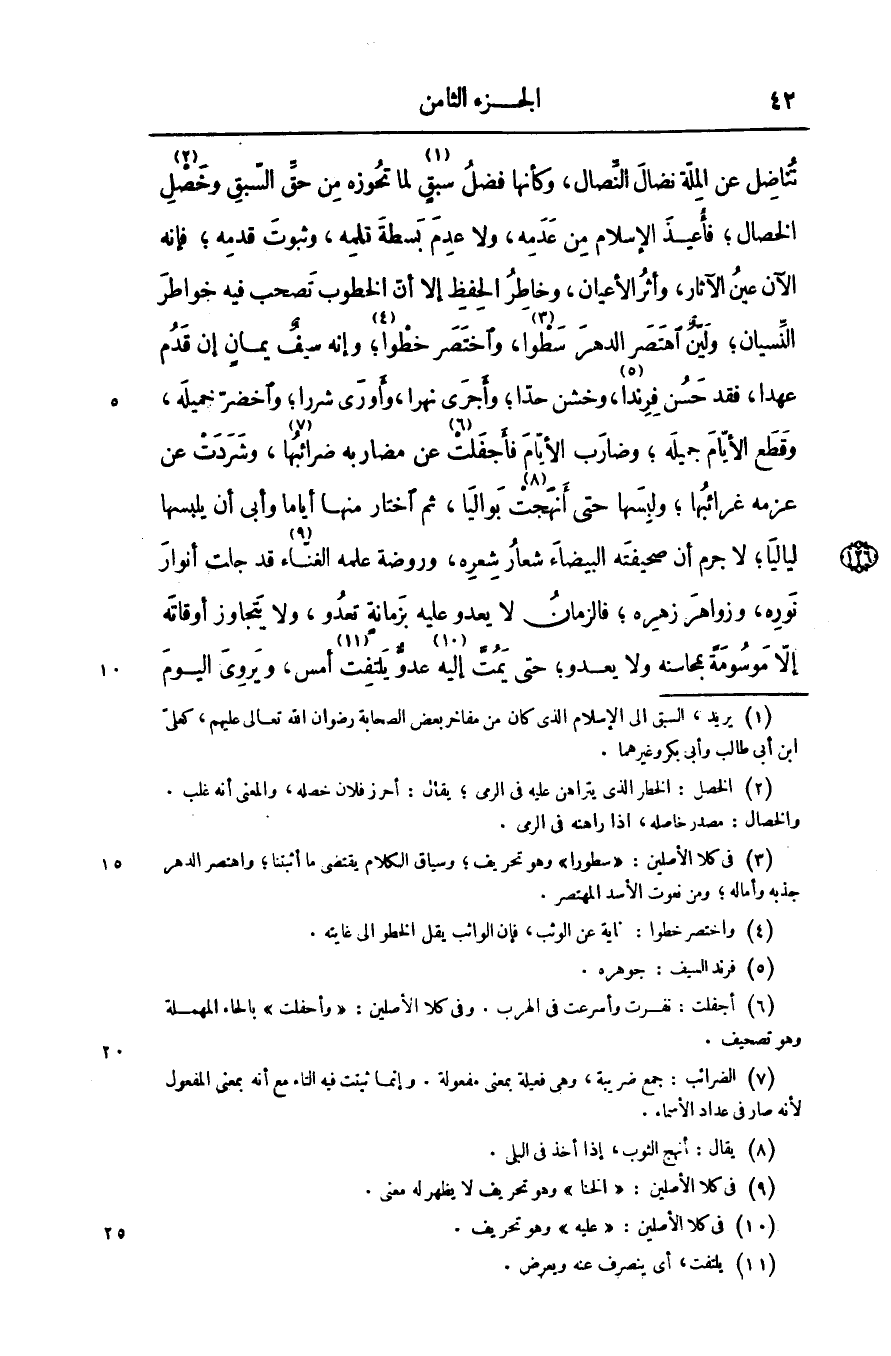 تناضل عن الملّة نضال النّصال، وكأنها فضل سبق «1» لما تحوزه من حقّ السّبق وخصل «2» الخصال؛ فأعيذ الإسلام من عدمه، ولا عدم بسطة تلمه، وثبوت قدمه؛ فإنه الآن عين الآثار، وأثر الأعيان، وخاطر الحفظ إلا أنّ الخطوب تصحب فيه خواطر النّسيان؛ وليّن اهتصر الدهر سطوا «3» ، واختصر خطوا «4» ؛ وإنه سيف يمان إن قدم عهدا، فقد حسن فرندا «5» ، وخشن حدّا؛ وأجرى نهرا، وأورى شررا؛ واخضرّ خميله، وقطع الأيّام جميله؛ وضارب الأيّام فأجفلت «6» عن مضاربه ضرائبها «7» ، وشردت عن عزمه غرائبها؛ ولبسها حتى أنهجت «8» بواليا، ثم اختار منها أياما وأبى أن يلبسها لياليا؛ لا جرم أن صحيفته البيضاء شعار شعره، وروضة علمه الغنّاء «9» قد جلت أنوار نوره، وزواهر زهره؛ فالزمان لا يعدو عليه بزمانة تعدو، ولا يتجاوز أوقاته إلّا موسومة بمحاسنه ولا يعدو؛ حتى يمتّ إليه «10» عدوّ يلتفت «11» أمس، ويروى اليوم