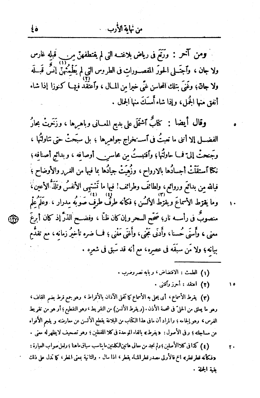 وقال أيضا: كتاب اشتمل على بديع المعانى وباهرها، وزخرت بحار الفضل إلا أننى ما تعبت فى استخراج جواهرها؛ بل سبحت حتى تناولتها، وجنحت إلىّ فما حاولتها؛ واقتبست من محاسن أوصافه، وبدائع أصنافه؛ نكتا استقلت أجسادها بالارواح، وزهيت جيادها بما فيها من الغرر والأوضاح؛ فيا لله من بدائع وروائع، ولطائف وطرائف! فيها ما تشتهى الأنفس وتلذّ الأعين، وما يقرّط الأسماع ويقرّط «3» الألسن؛ فكأنه طرف طرف «4» صوبه مدرار، وعلم علم منصوب فى رأسه نار؛ صحّح السحر وإن كان ظنّا، وفضح الدّرّ إذ كان أبرع معنى، وأسنى حسنا، وأدنى مجنى، وأغنى مغنى؛ فما ضره تأخير زمانه، مع تقدّم بيانه؛ ولا من سبقه فى عصره، مع أنه قد سبق فى شعره.