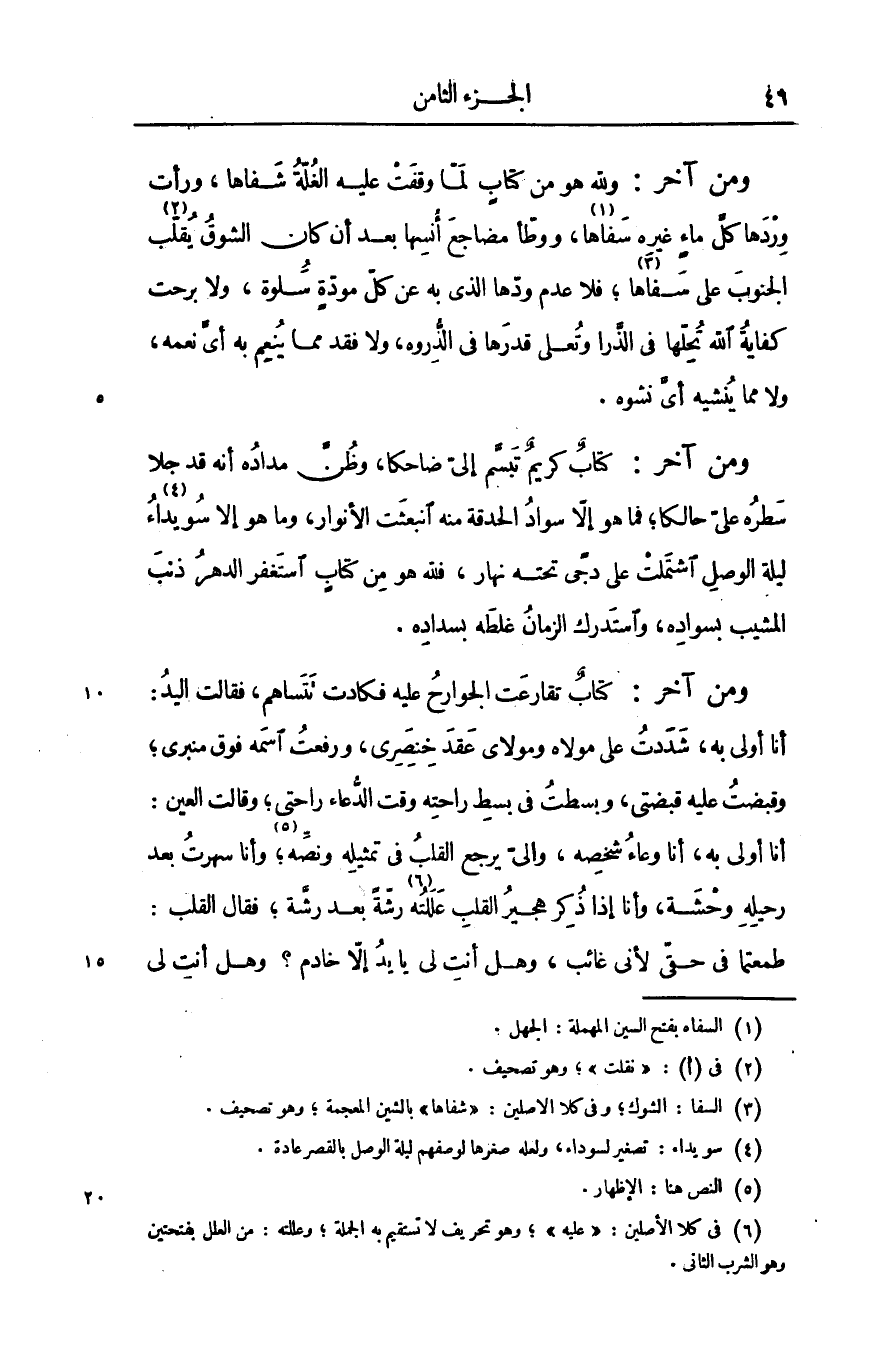ومن آخر: ولله هو من كتاب لمّا وقفت عليه الغلّة شفاها، ورأت وردها كلّ ماء غيره سفاها «1» ، ووطّأ مضاجع أنسها بعد أن كان الشوق يقلّب «2» الجنوب على سفاها «3» ؛ فلا عدم ودّها الذى به عن كلّ مودّة سلوة، ولا برحت كفاية الله تحلّها فى الذّرا وتعلى قدرها فى الذّروه، ولا فقد مما ينعم به أىّ نعمه، ولا مما ينشيه أىّ نشوه.